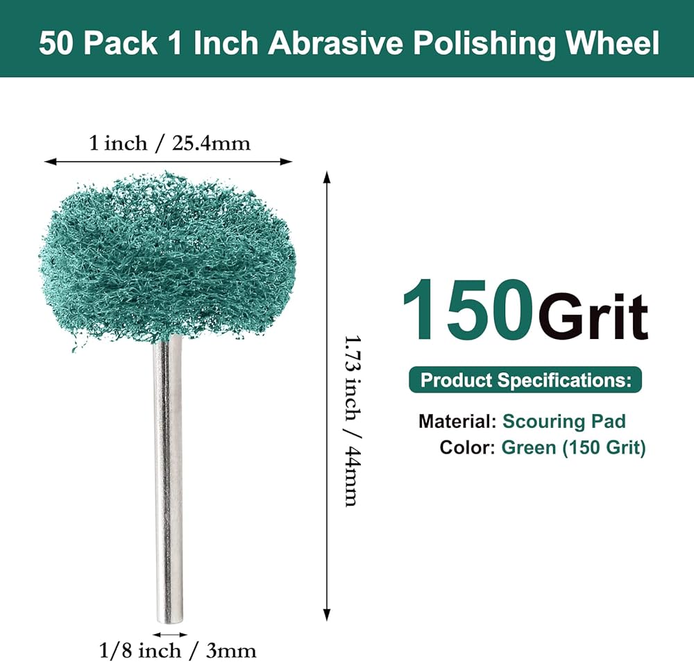 تحتوي العبوة على: 50 × عجلات تلميع كاشطة، النوع: أسود (300 حبيبة)، قطر التلميع: 1 بوصة / 25.4 مم، قطر الساق: 1/8 بوصة / 3 مم.