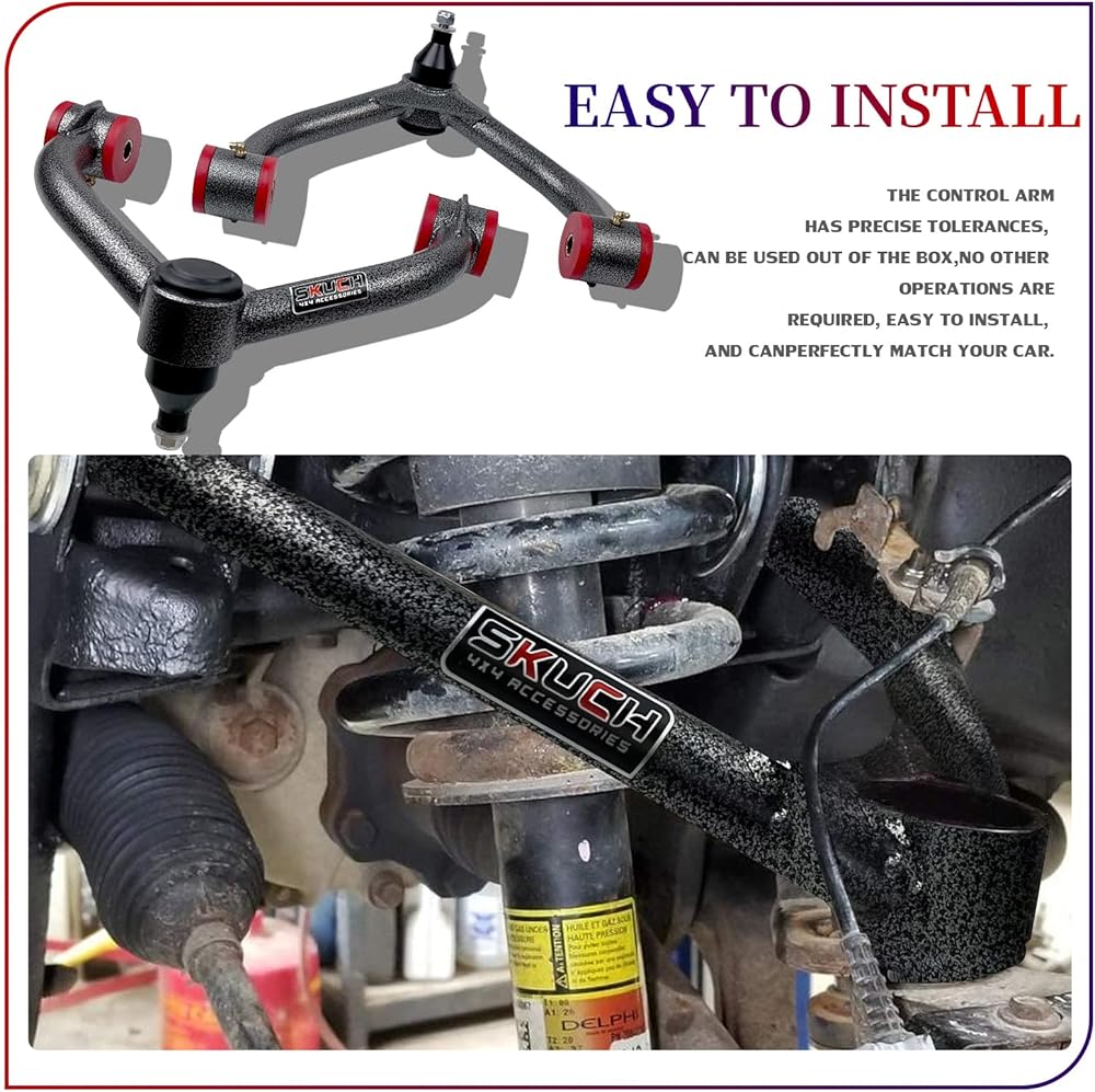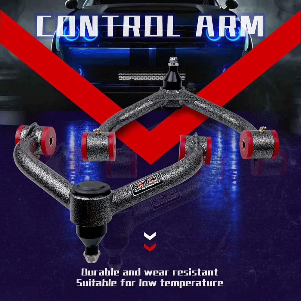 -- The front upper control arms can offer better stable and reinforced structure. Replacement the factory control arms,it will lift 2-4 inches for yourtruck and give your truck an aggressive look.