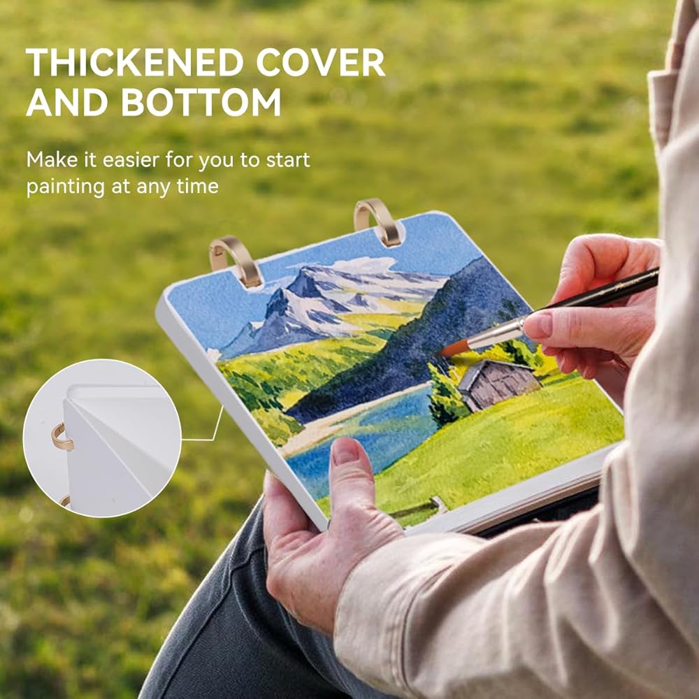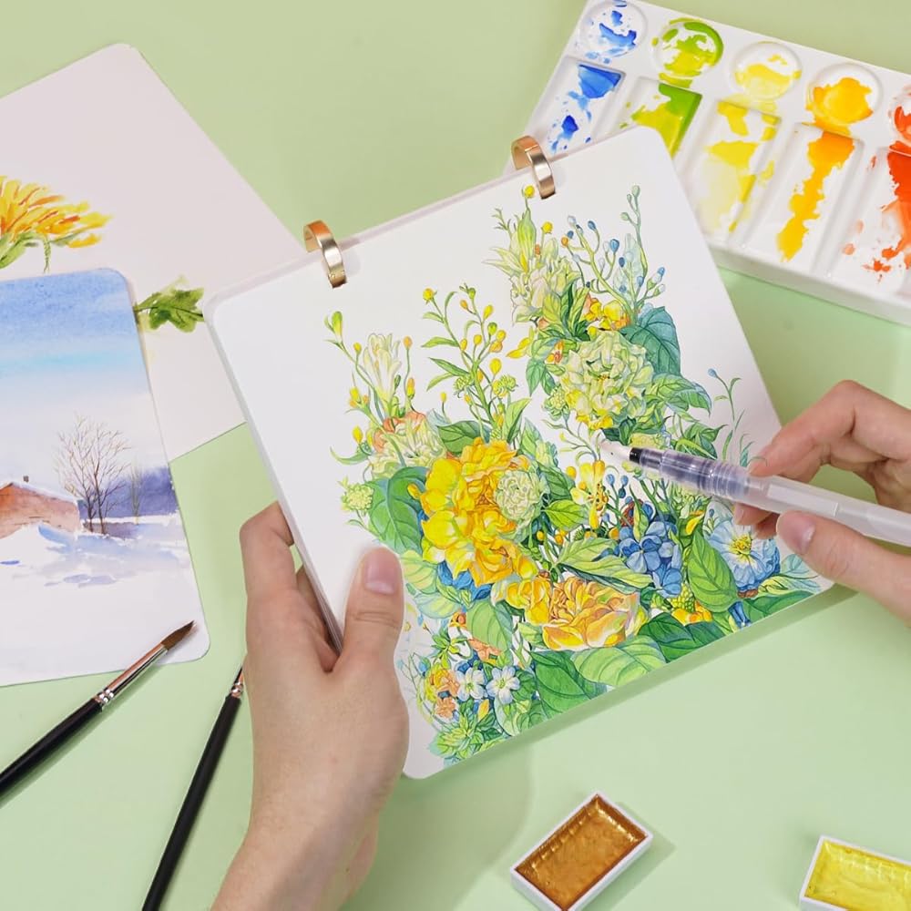 • حلقات قابلة للفصل: تم تصميم دفتر رسم الألوان المائية بحلقاته الفريدة القابلة للفصل للفنانين الذين يقدرون المرونة والراحة في عمليتهم الإبداعية. تم تصميم كراسة الرسم هذه باستخدام حلقتين مصممتين بدقة، مما يسمح لك بإزالة الصفحات واستبدالها دون عناء أثناء جلسات الرسم أثناء التنقل. نصائح: ما عليك سوى إدخال قطعة معدنية صغيرة في واجهة الحلقات من أجل فتح سلس.