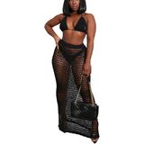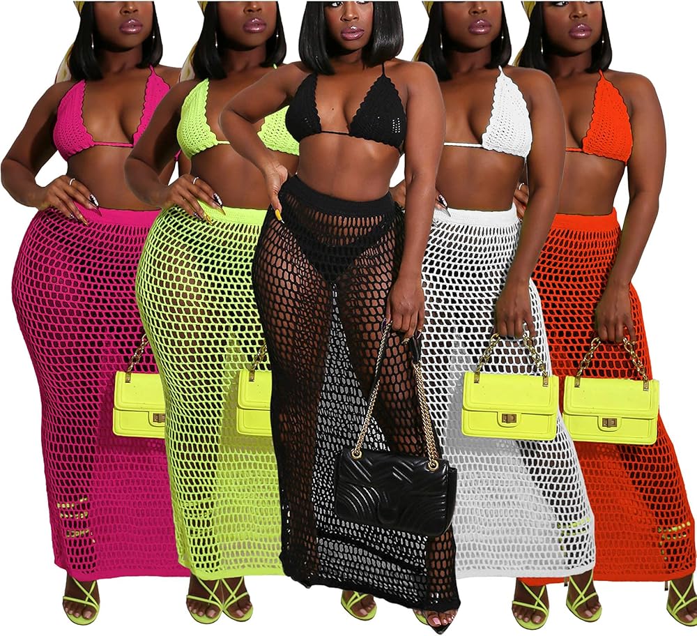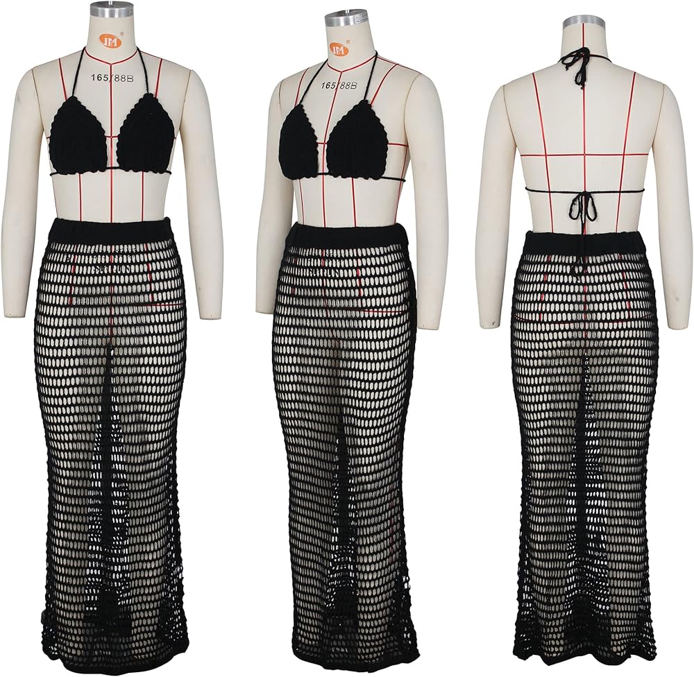 Women Sexy Beach Coverups Summer 2 Piece Outfits Crochet Mesh Fishnet Bikini Top and Maxi Skirt Set