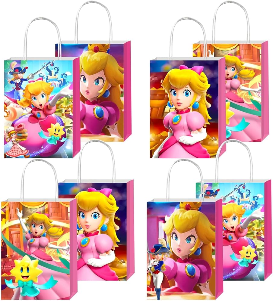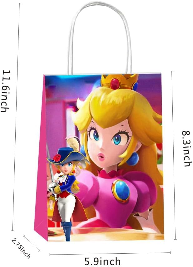 【Cute Design】: Princess Peach gift bags is 8.3"x5.9" x2.75". All gift bags are sturdy and supported many candies you put inside.