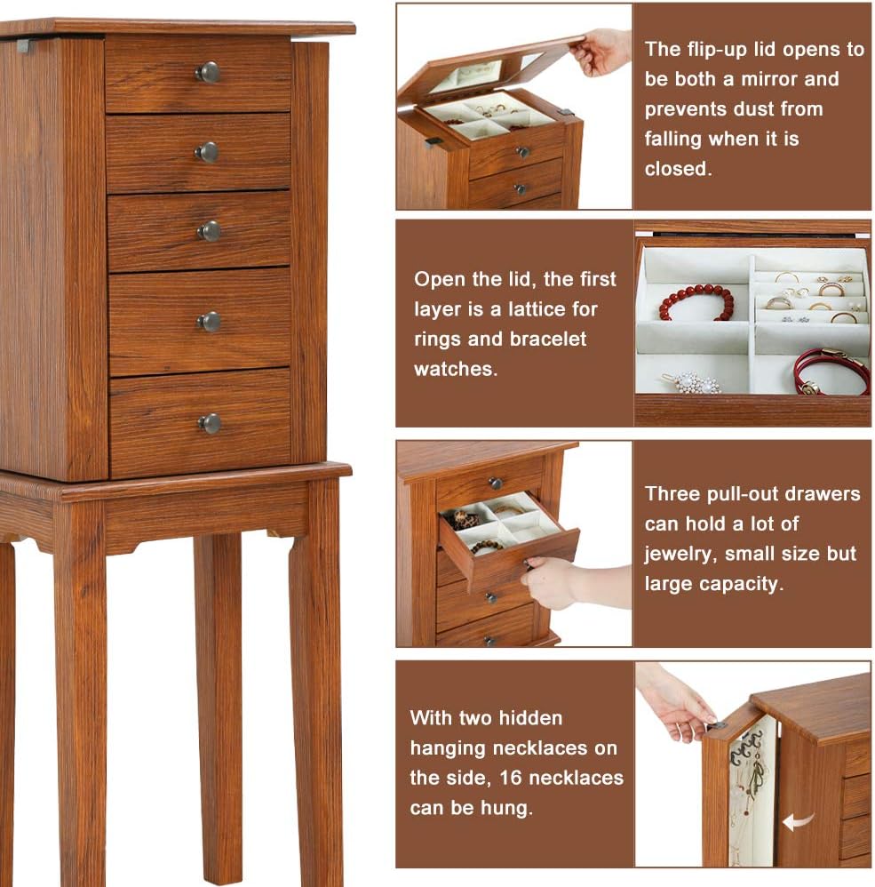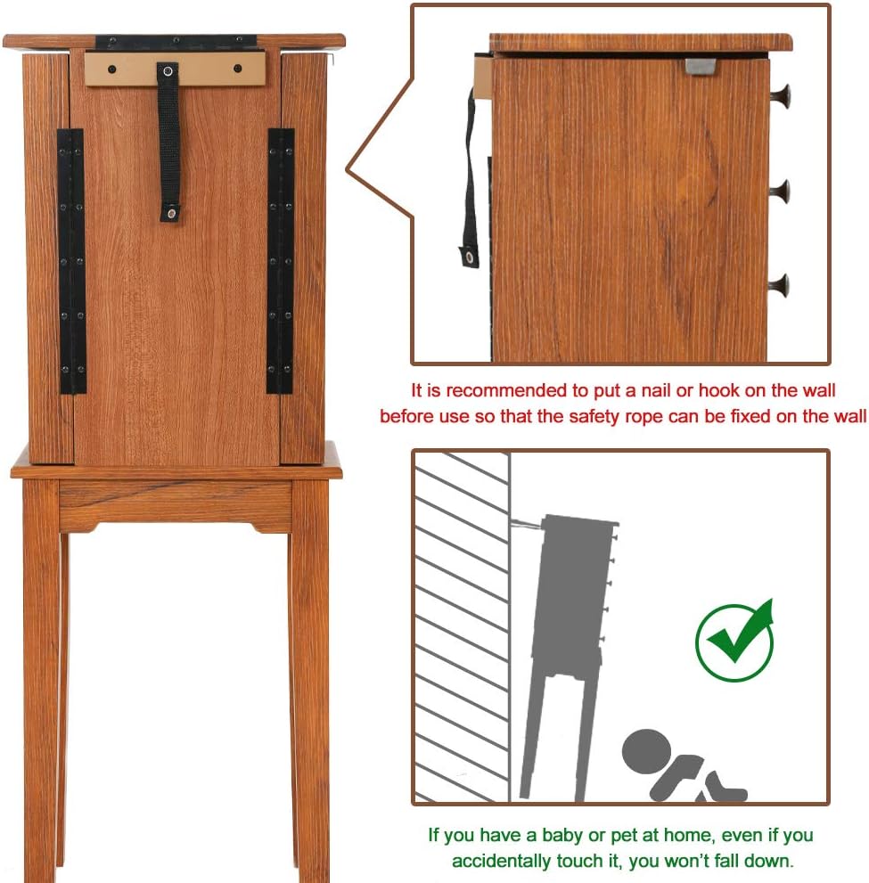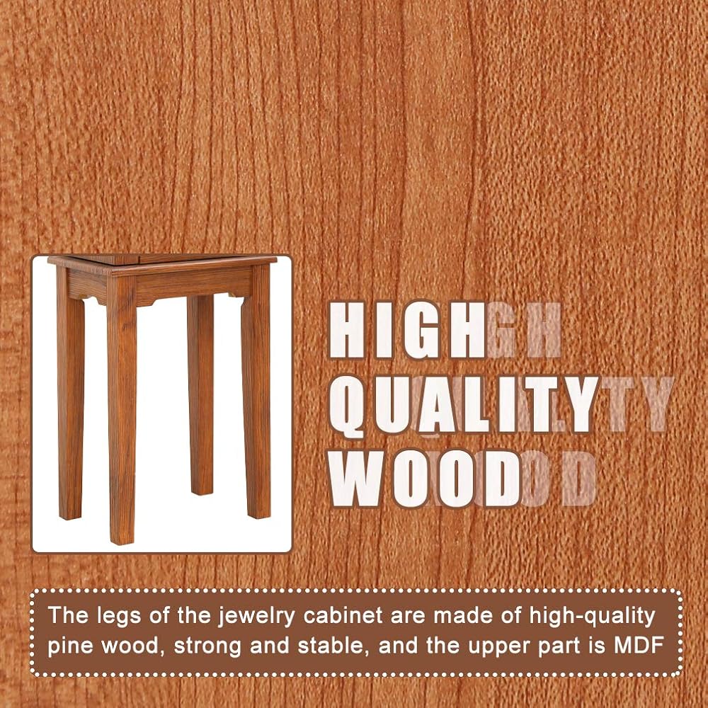 The Top Has A Flip Mirror :At the top of the jewelry cabinet is a 7*6inch mirror, which can help you check your appearance and help you wear your earrings and necklaces.