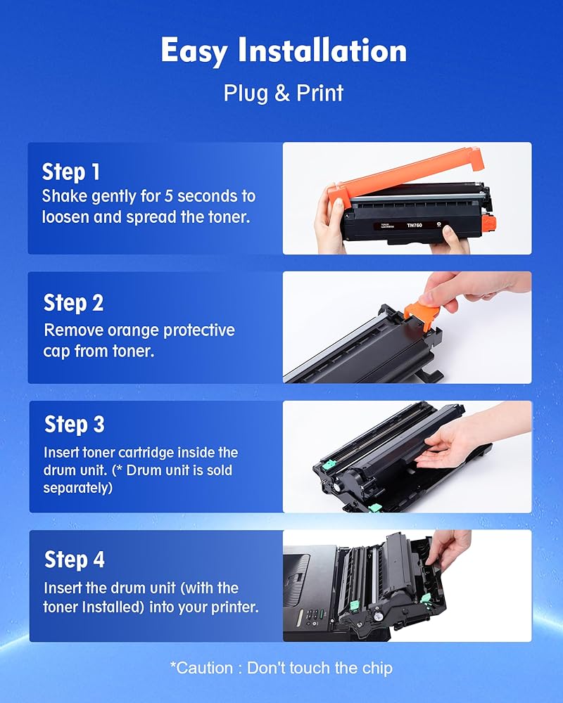 - محتويات العبوة: 4 أسود من حبر tn760 لطابعة Brother، 1 × دليل المستخدم