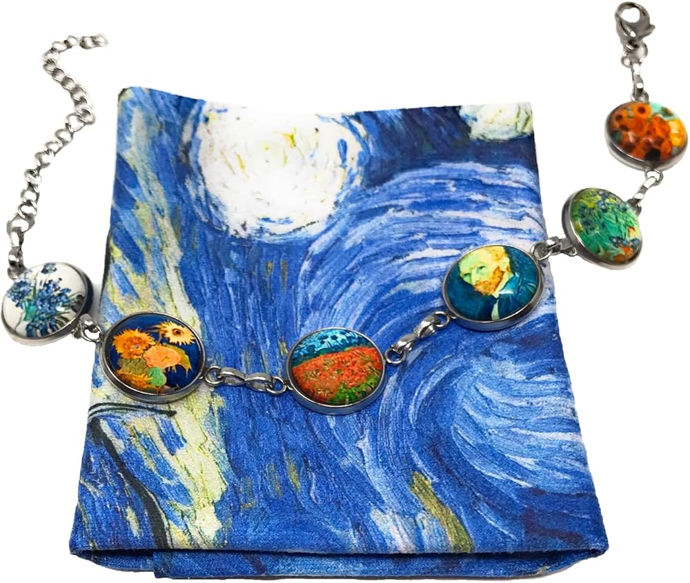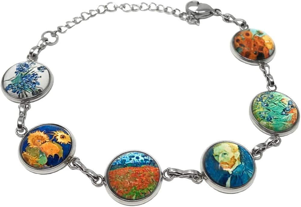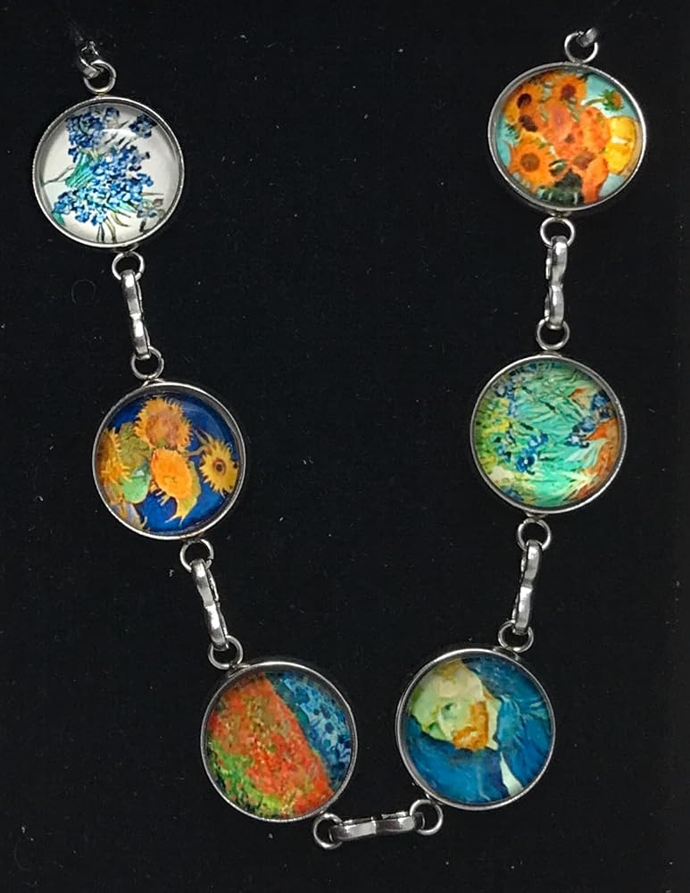 ** فن مجموعة VAN GOGH ** على هذا السوار ترتبط اللوحات الشهيرة معًا: قزحية، مزهرية مع اثنتي عشرة زهرة عباد الشمس، صورة شخصية، حقل مع الخشخاش، مزهرية مع خمس عباد الشمس. الصور موجودة تحت قباب زجاجية بحجم نصف بوصة.