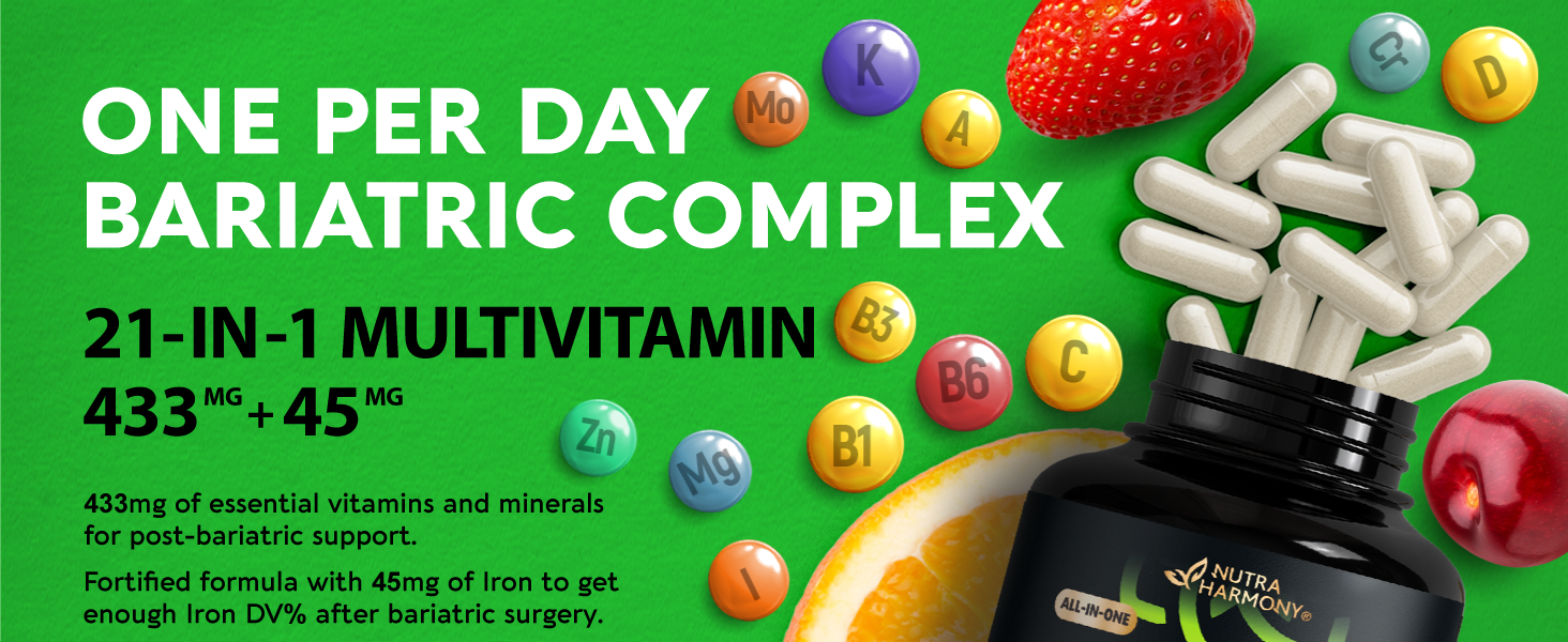 💚 دعم ما بعد السمنة 21 في 1 - فيتامينات متعددة لعلاج السمنة من NUTRAHARMONY تم تصميمها وتطويرها لتلبية احتياجات الرجال والنساء في جميع أنواع جراحة ما بعد السمنة. فيتامينات تحويل مسار المعدة تحتوي على فيتامينات متعددة كاملة من جميع الفيتامينات والمعادن الأساسية الـ 21.