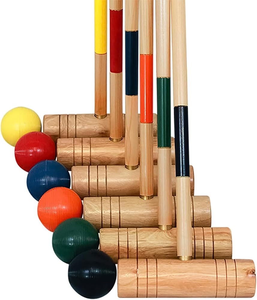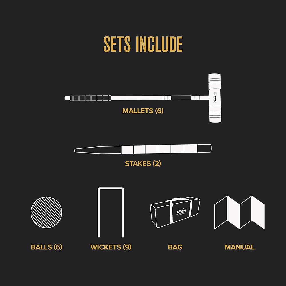 SET INCLUDES- (6) multi-colored poly-resin croquet balls, (9) 8. 25” Steel Wickets, (2) 24” hardwood scoring posts, and official croquet rulebook