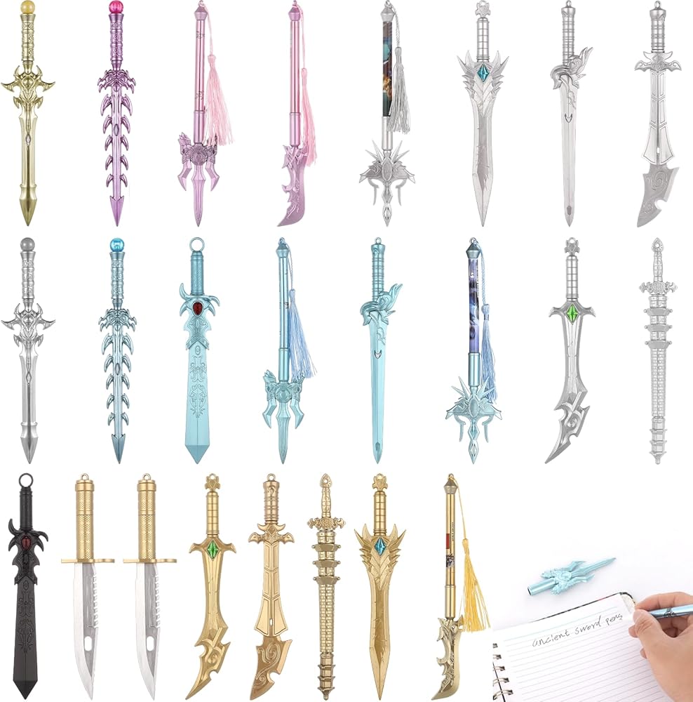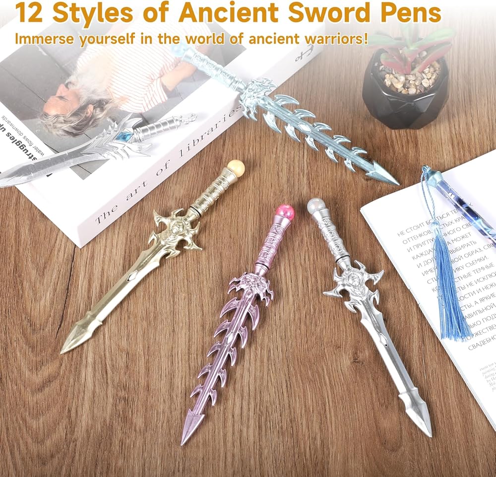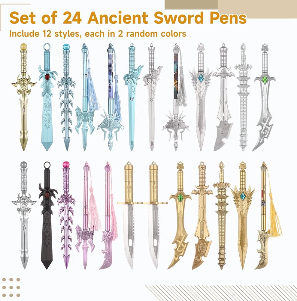 【24 قطعة من أقلام السيف في 12 نمطًا】 احتضن جاذبية مجموعة أقلام السيف القديمة الخاصة بنا! مع 24 قطعة و12 نمطًا فريدًا، بما في ذلك Phoenix Seeker وDivine Katana والمزيد، أطلق العنان لخيالك. يأتي كل قلم بلونين عشوائيين، مما يوفر وفرة من الخيارات لإرضاء خيالاتك الجامحة!