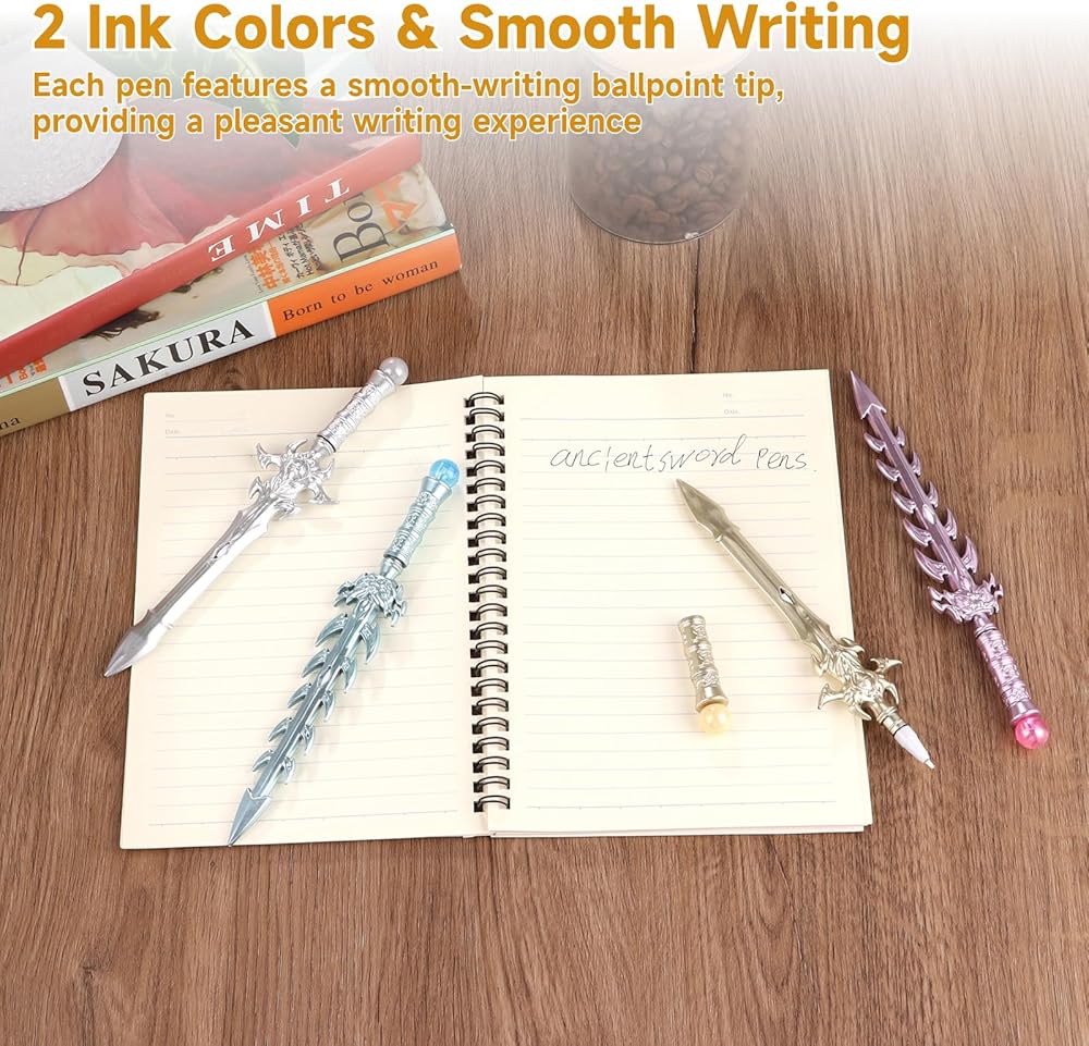 【تصميمات رائعة وواقعية】 شاهد التفاصيل المعقدة لأقلامنا، المصنوعة بعناية لتقليد الميزات المذهلة للسيوف القديمة. من المقابض المزخرفة إلى الشفرات الرقيقة، ينضح كل قلم بالقوة والفن، مما يجعل الكتابة تجربة غير عادية.