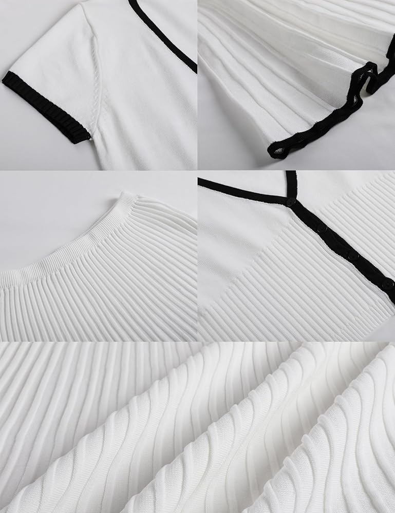 قمصان قصيرة: بلوزة بأكمام قصيرة مع خط رقبة عميق وزر للإغلاق في الأمام، مبطنة بأنابيب متباينة، صدرية مضلعة مع تفاصيل حاشية تمنحها مظهرًا جميلاً ومطاطًا