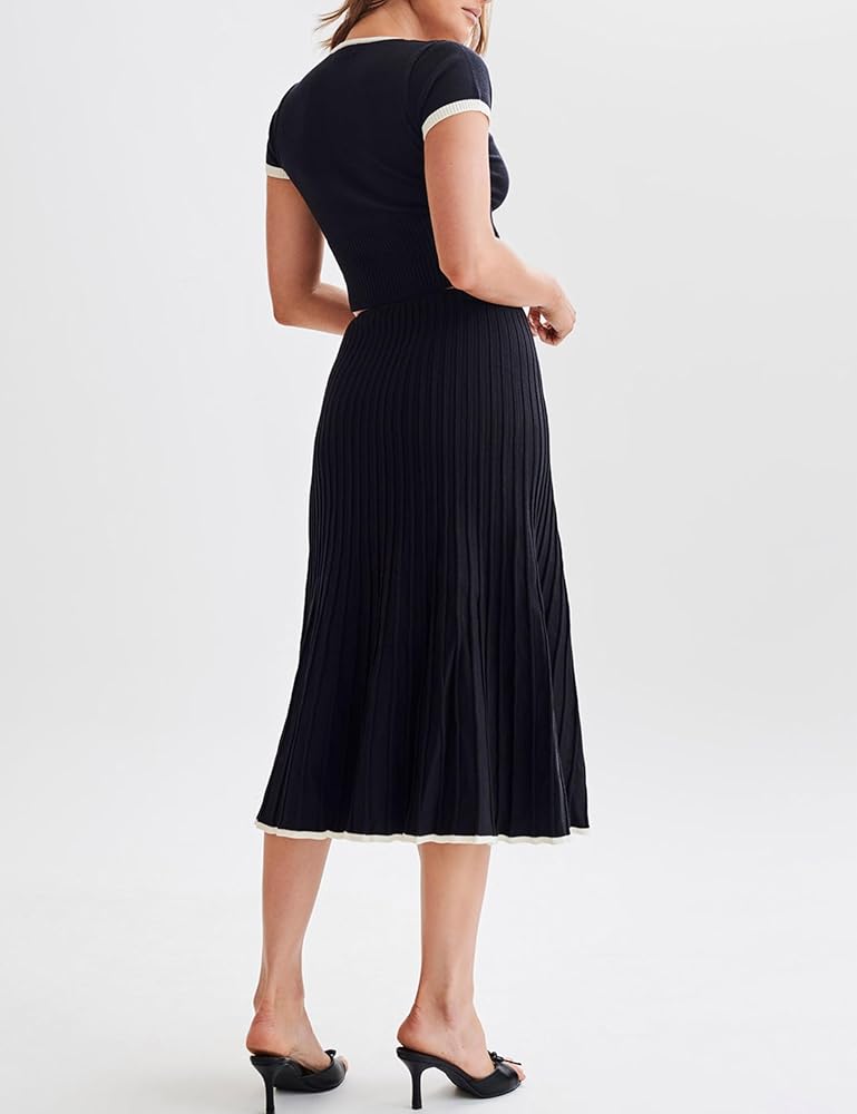 تنورة مطوية: تنورة متوسطة الطول سوداء مصممة بحاشية واسعة قليلاً وقصة بطول متوسط، لتعديل نسبة جسمك بطريقة جذابة، الفستان المنسوج يلمع بتصميمه البسيط والسهل