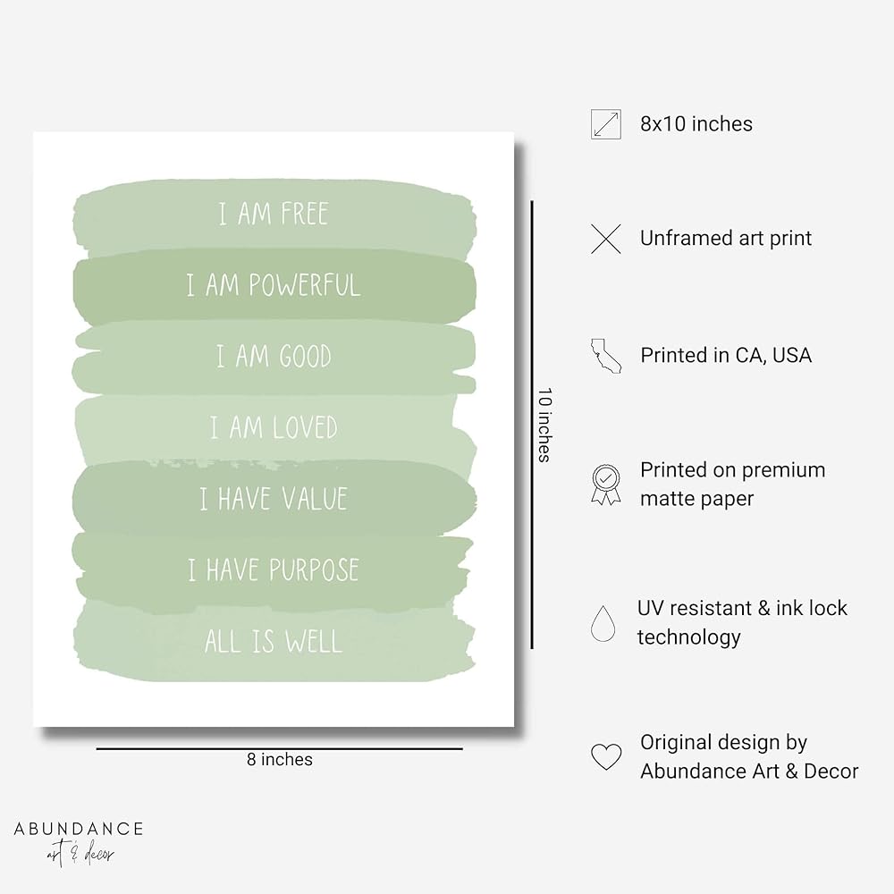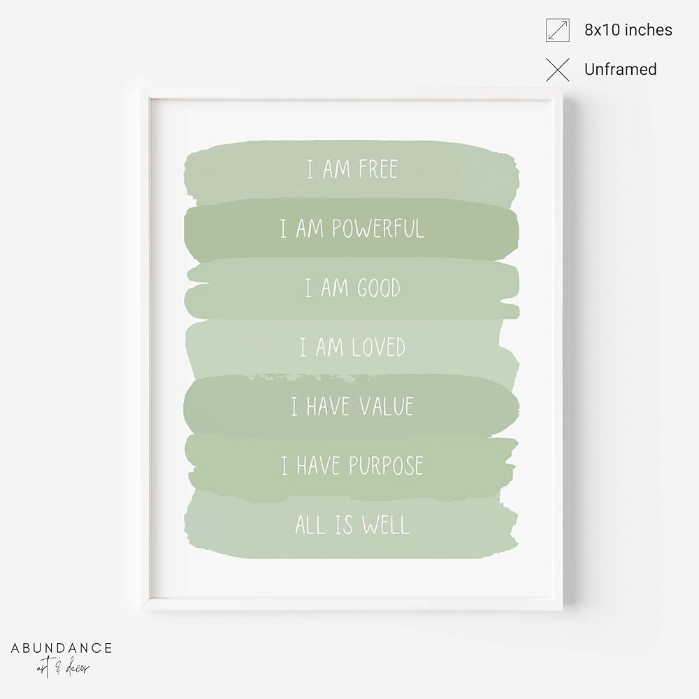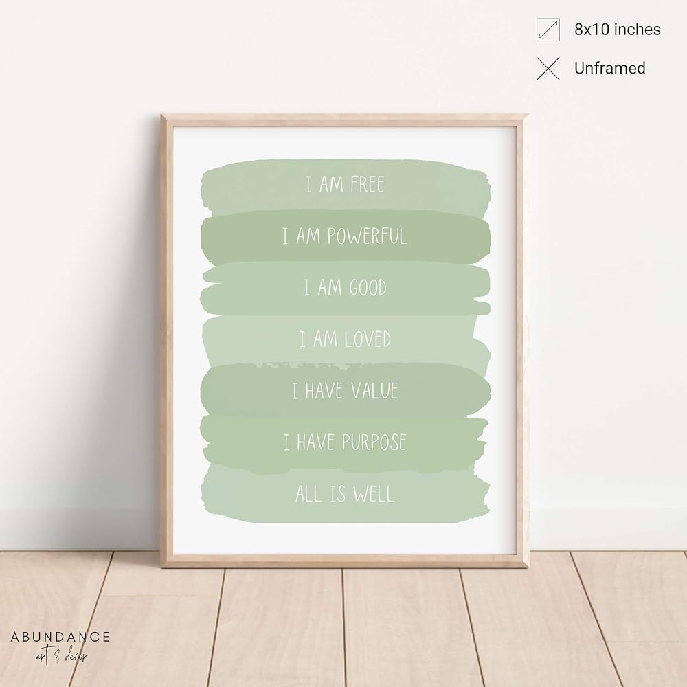 Looking for calming, functional, and inspirational wall decor? Get inspired and raise the vibe of any space with this positive affirmations wall décor. This soothing sage green print looks great while reinforcing positive daily affirmations to improve self confidence, love for self and others, and self appreciation. The print reads: I am free, I am powerful, I am good, I am loved ,I have value, I have purpose, All is well. This art print fits so many styles cute bathroom decor, minimalistic room decor, little girl room decor, sage green bathroom decor, aesthetic room decor peacful, green bedroom decor, kids wall decor, cute wall decor, toddler room decor, quotes wall decor, motivational posters, buddha wall art, inspirational quotes wall art, botanical decor, zen wall art, sage decor, zen office decor, green decor for bedroom, sage bathroom decor, zen wall decor, motivational art, positive quotes, sage green wall art.