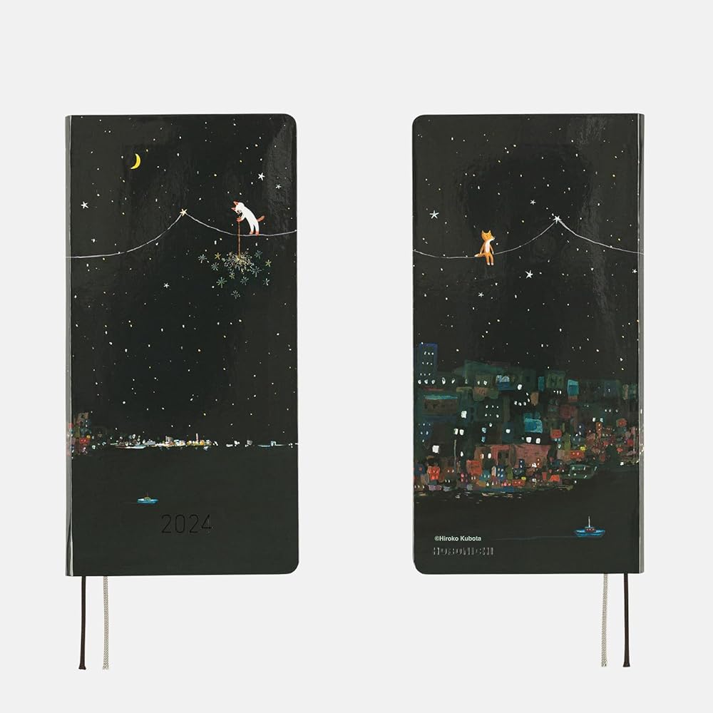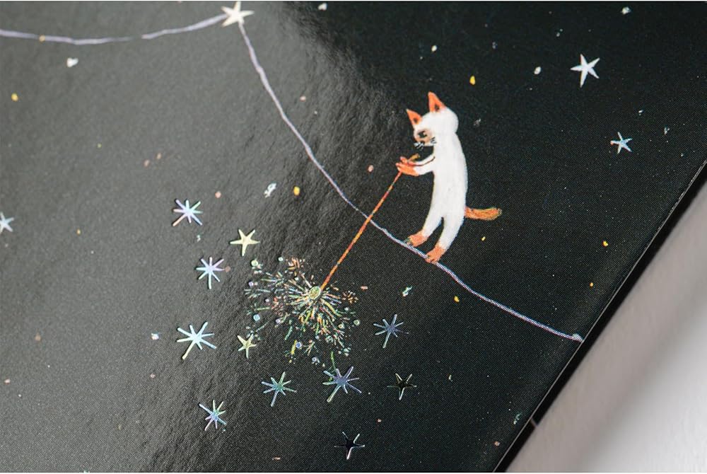 مشهد ليلي مظلم يلفه صمت الهواء. استمع عن كثب ويمكنك تقريبًا سماع صوت طقطقة الألعاب النارية التي تحملها القطة. وربما جاءت النجوم الملونة المتنوعة في السماء من هذه الشرارات. هذا المشهد للرسامة هيروكو كوبوتا لا يشيخ أبدًا مهما نظرت إليه من مرات عديدة. لقد جربت مجموعة متنوعة من الأنماط المختلفة عند تصميم هذا لكتاب الأسابيع.