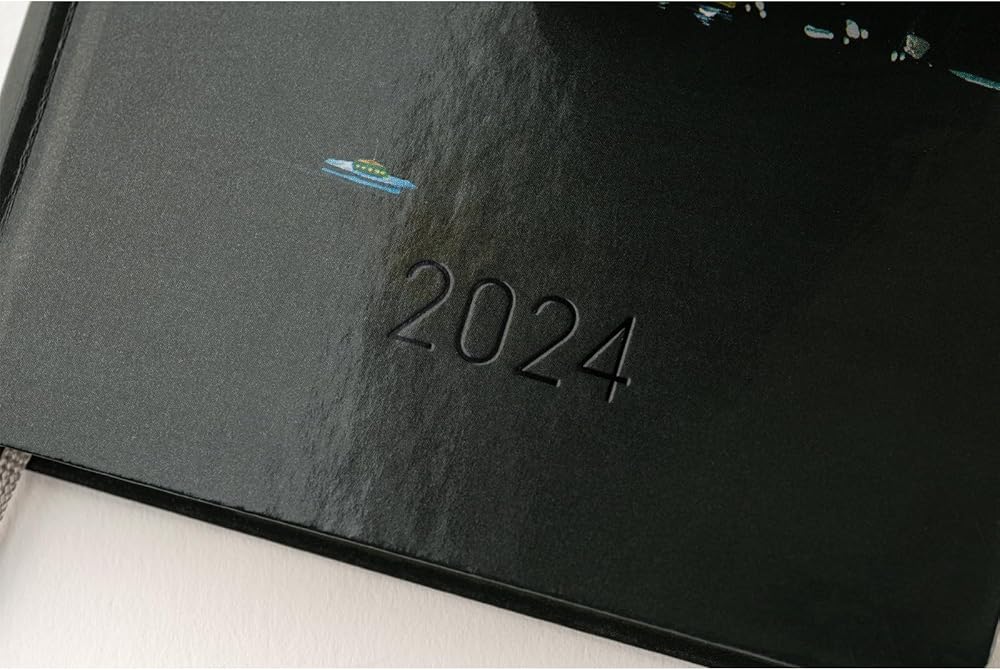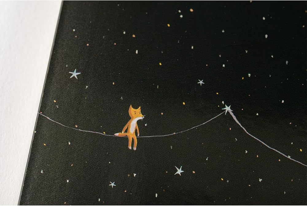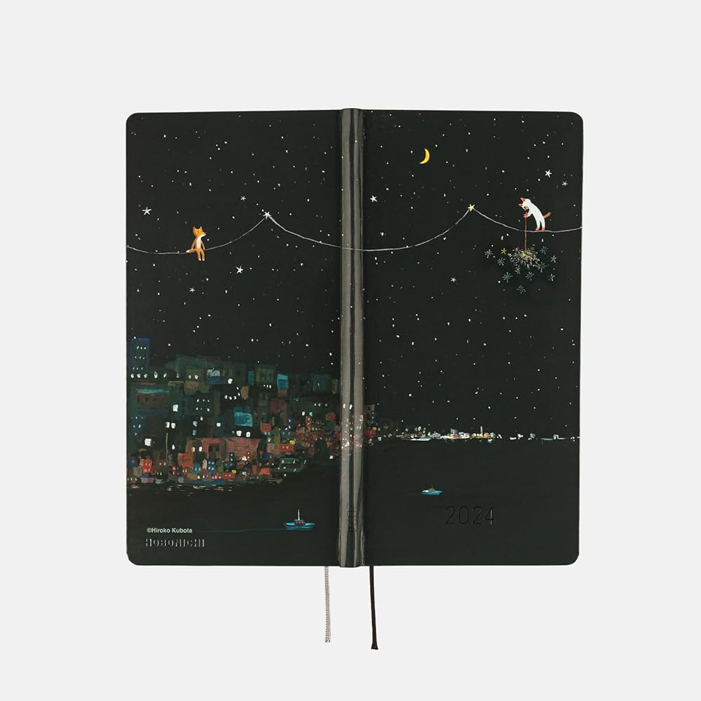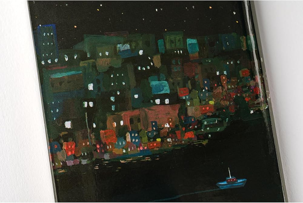 الرسم التوضيحي في السماء هو أول ما يلفت انتباهك، ولكن منظر مدينة الأشخاص الذين يعيشون هناك ساحر أيضًا. يشعر مشهد شاطئ البحر ليلاً بالوحدة والدفء. عام 2024 مطبوع بالحبر الأسود.