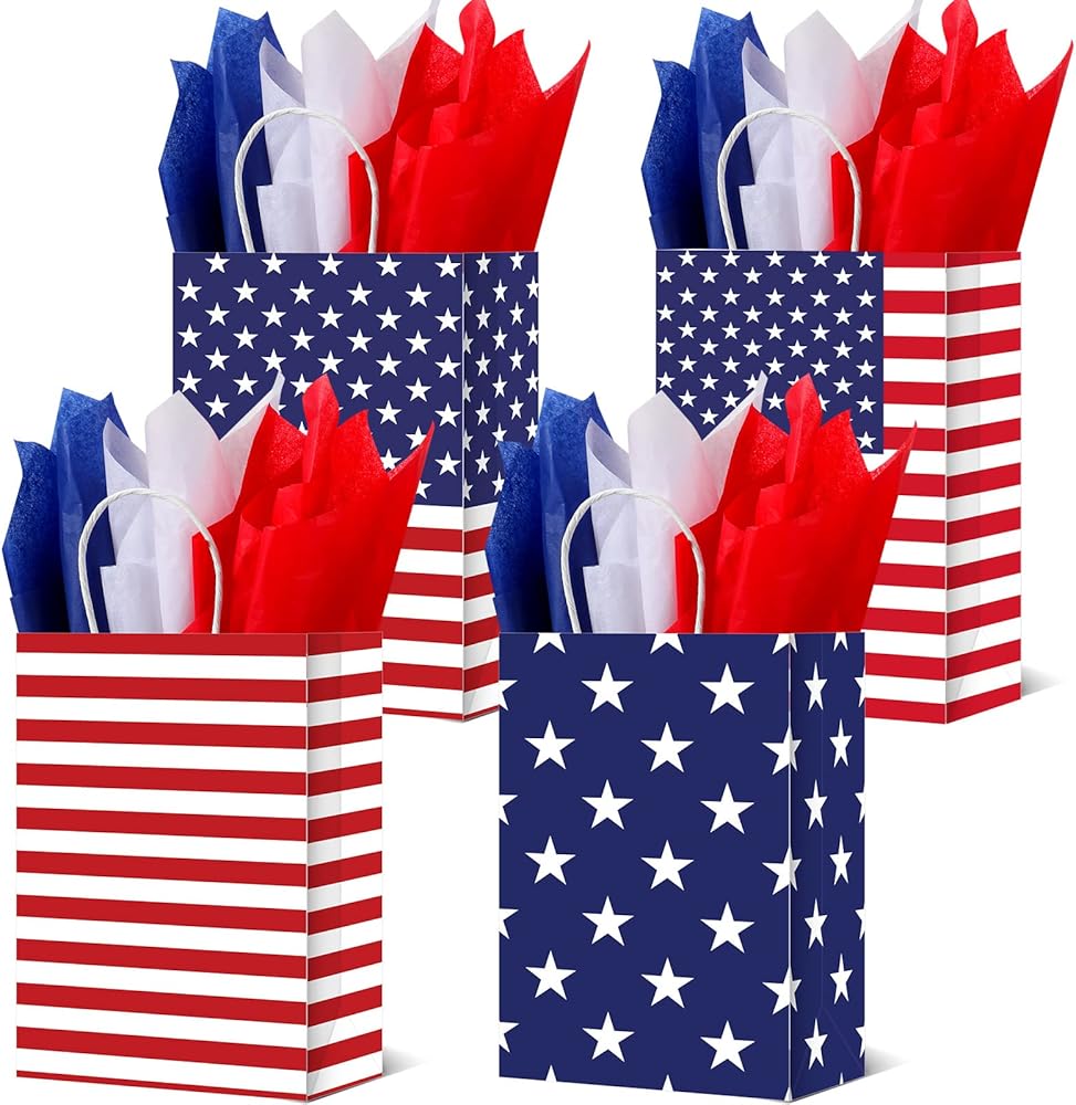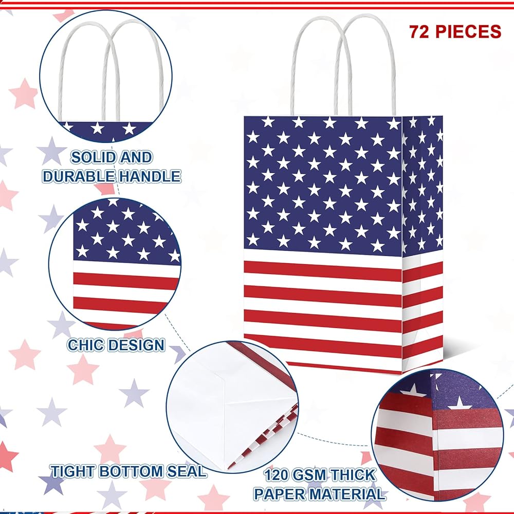 Sufficient Quantity: you will get 72 pieces patriotic gift bags in 4 styles and 72 pieces American tissue papers in 3 colors, which can help you to wrap gifts quickly and easily, and the rich quantity will meet your needs for daily and various parties or events