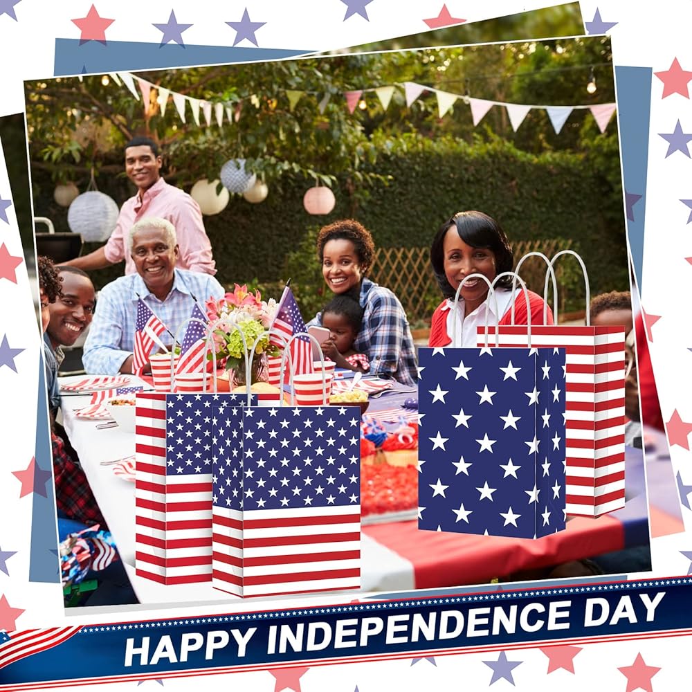 Reliable Material: these 4th of July goodie bags are made of quality paper, thick and sturdy, safe and reusable, handle design make them easy to carry