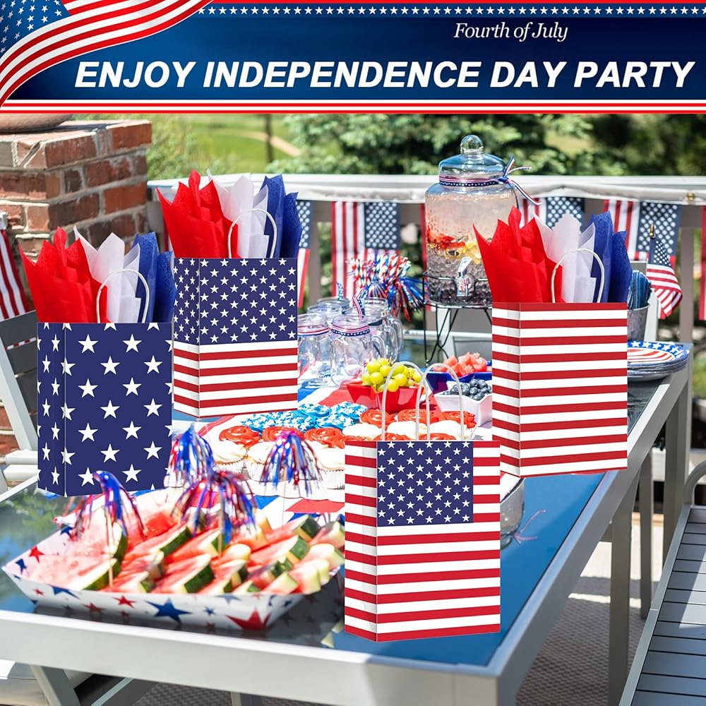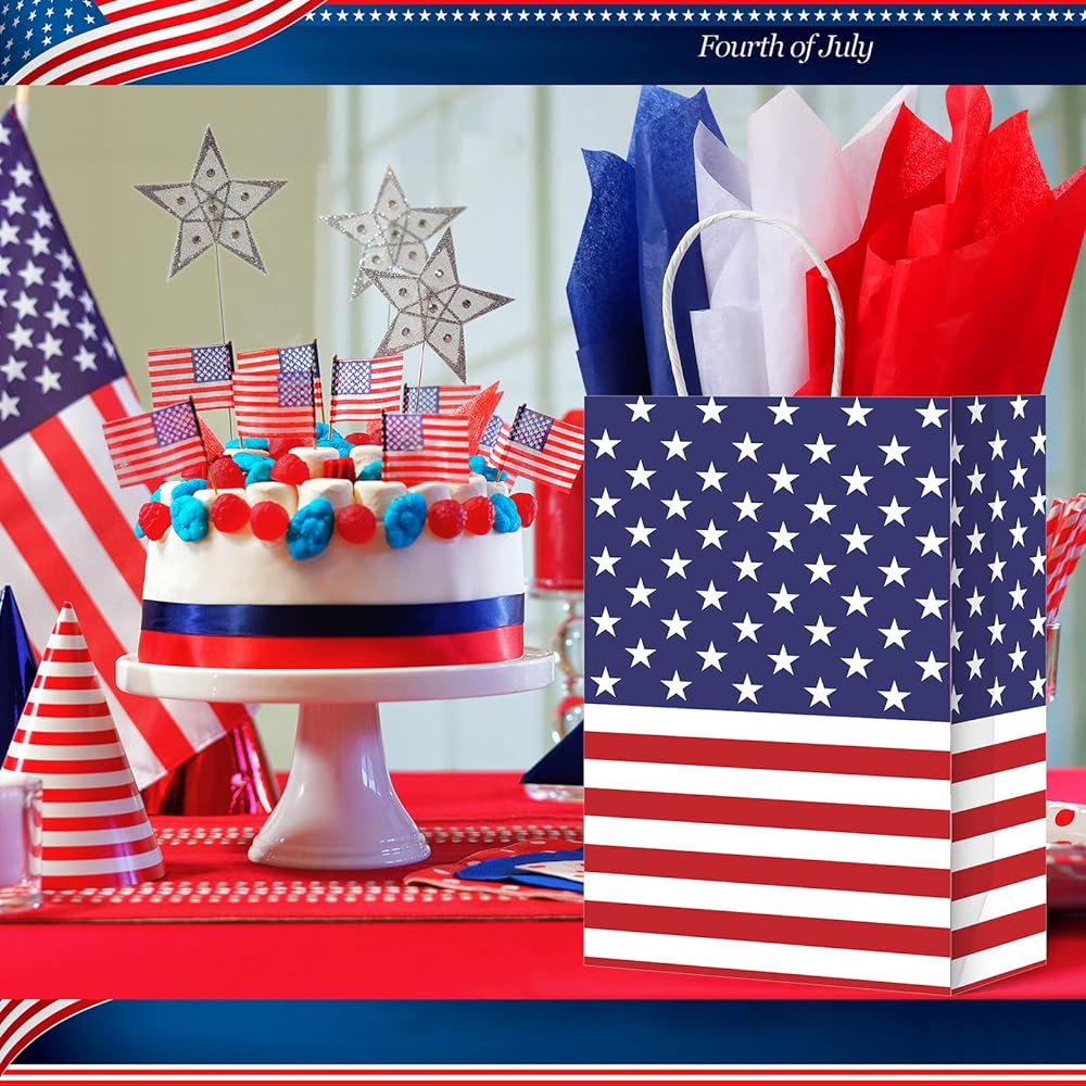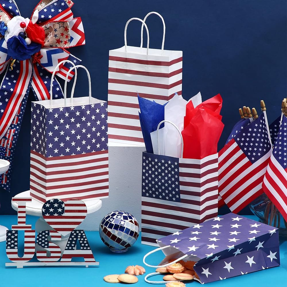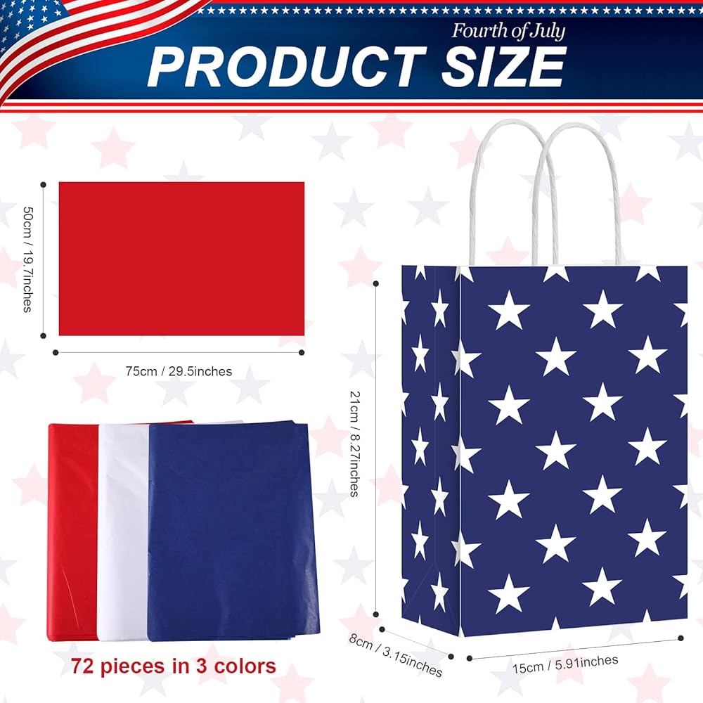Proper Size: each Independence Day gift bag measures about 8.27 x 5.91 x 3.15 inches/ 21 x 15 x 8 cm, the tissue paper measures about 29.5 x 19.7 inches/ 75 x 50 cm, which is suitable for holding Independence Day party favors, snacks, cookies, chocolates, candies, gifts, toys and more accessories