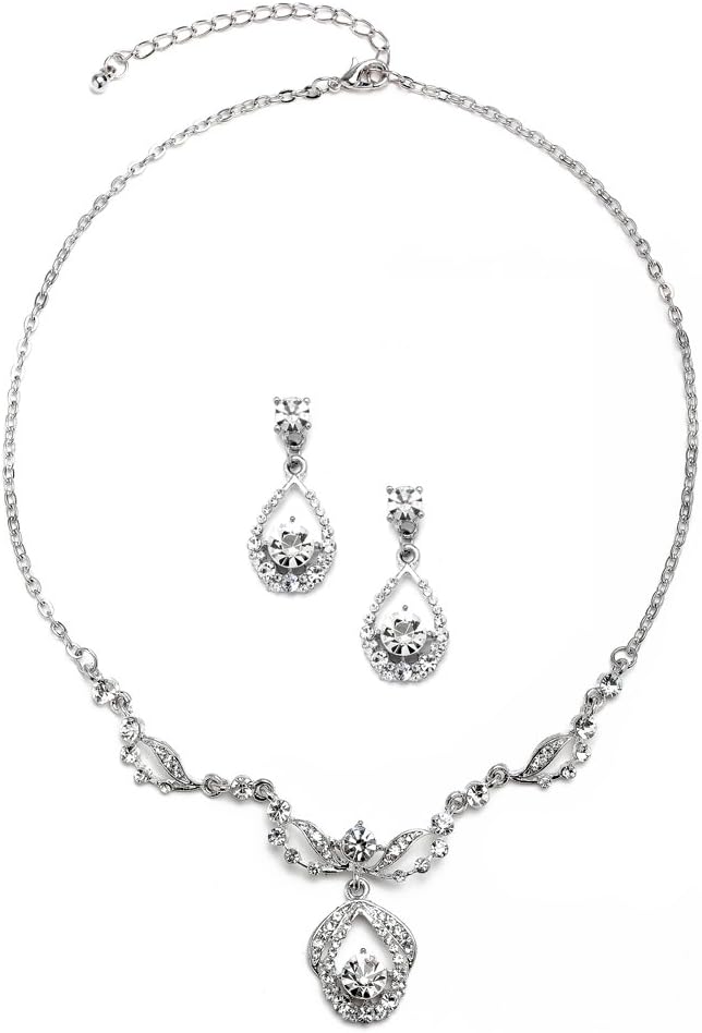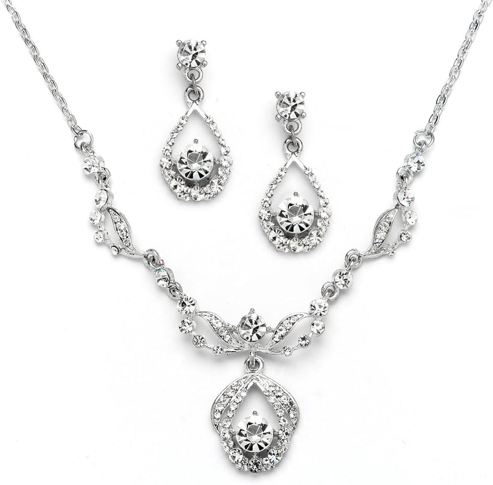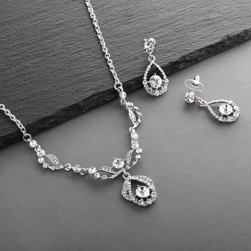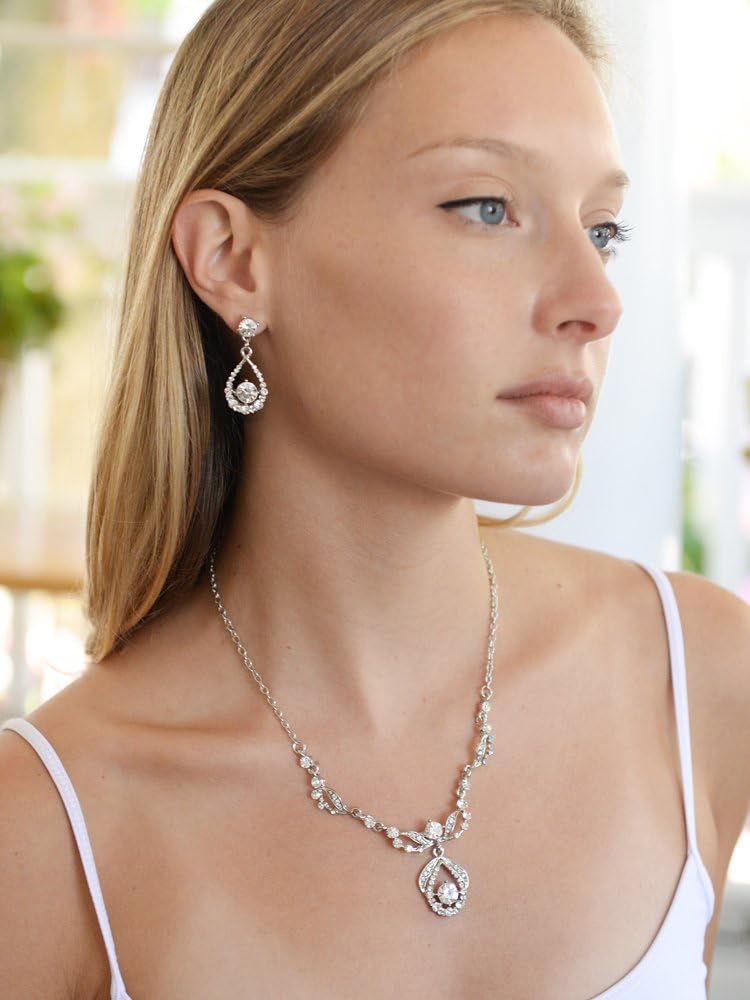 • LUXURY STYLE: Vintage Style Art Deco Inspired Bridal, Bridesmaids or Prom Crystal Necklace and Earrings Set, Genuine Silver Platinum Plating with Enduring Luster, Sophisticated Antique Reproduction Styling for Every Bride or Wedding Party Member