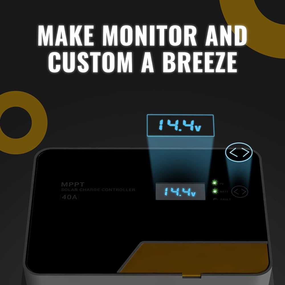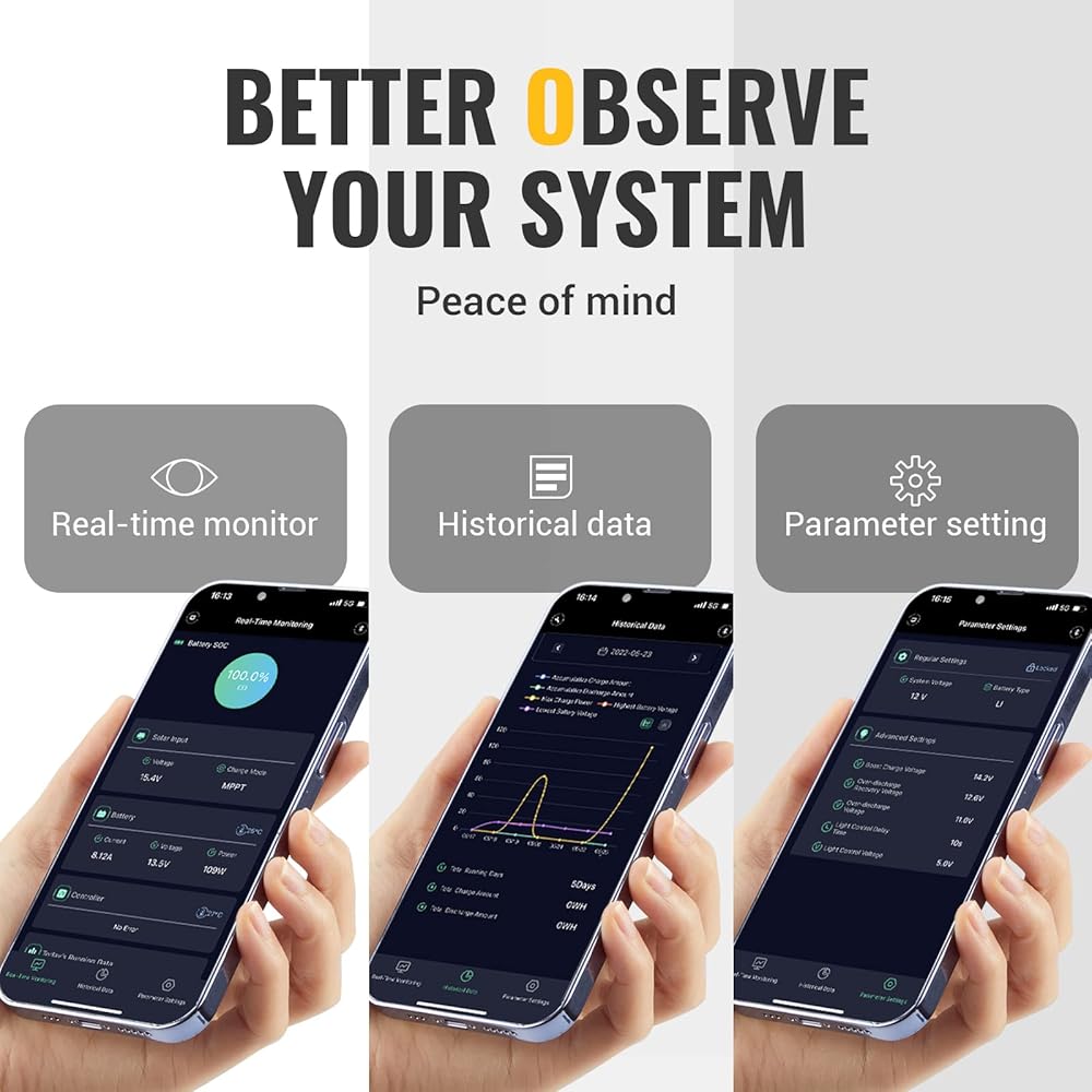 مراقبة سهلة: إقران وحدة التحكم بالطاقة الشمسية بهاتفك عبر ChargePro 2.0، مما يجعل رؤية بيانات الإخراج والتاريخ أمرًا سهلاً، كما يسمح أيضًا بضبط جهد الشحن والتيار وما إلى ذلك لأنواع مختلفة من البطاريات. يوفر جهاز التحكم عن بعد في التطبيق إشارة بطول 15 قدمًا.