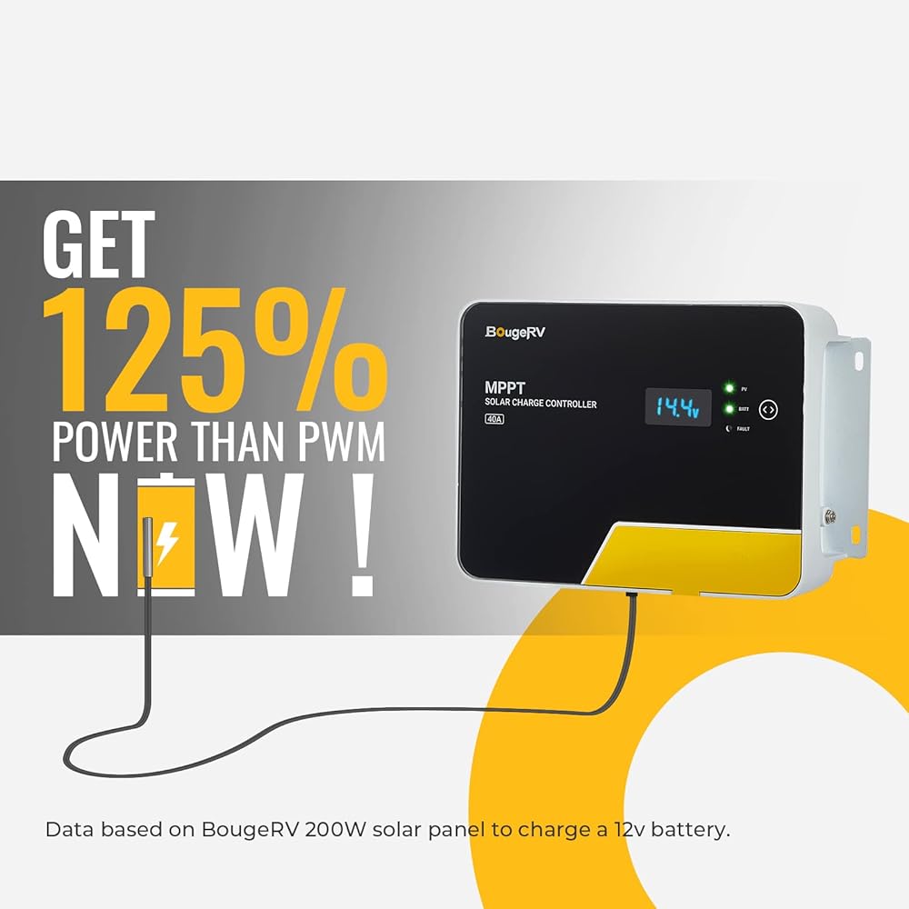 جهاز التحكم بالشحن الشمسي BougeRV MPPT 40A، مع جهاز تحكم عن بعد في التطبيق، شاشة LCD بإضاءة خلفية، مستشعر درجة الحرارة، منظم بطارية 12 فولت/24 فولت/36 فولت/48 فولت، لـ LiFePO4، SLD، AGM، FLD، بطارية جل، أرض سلبية