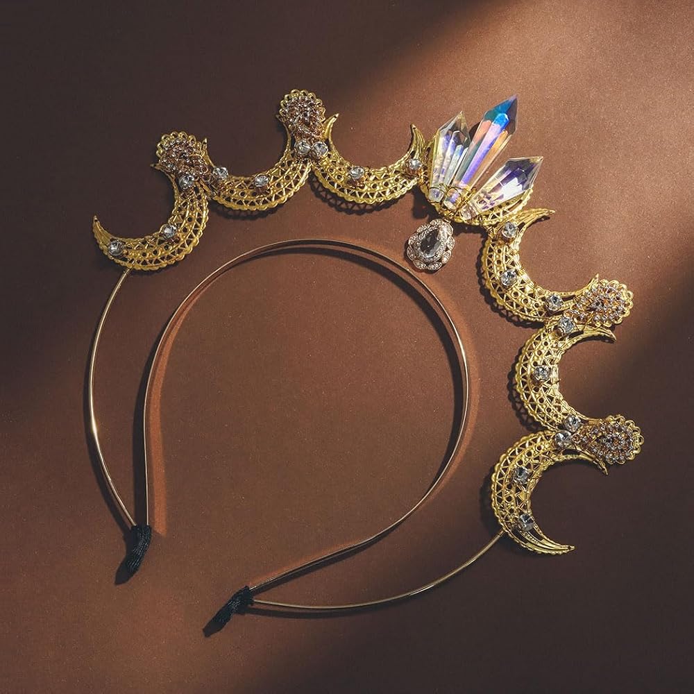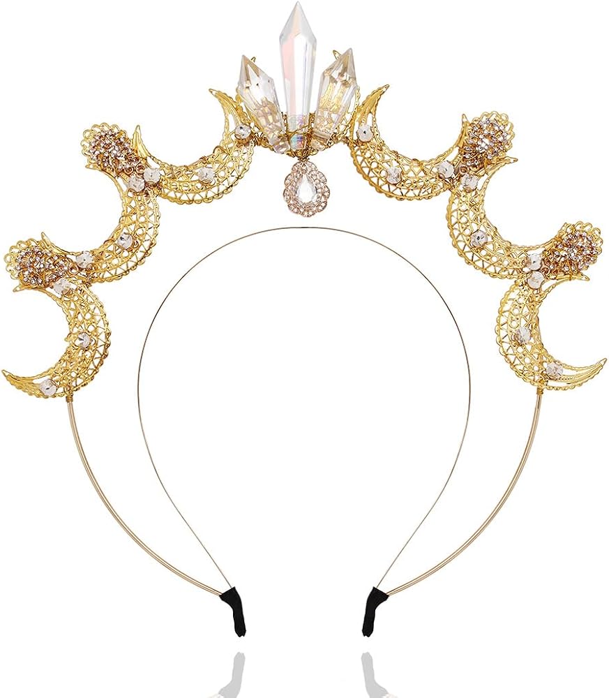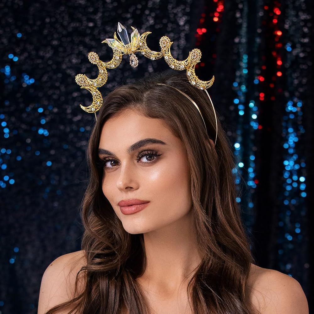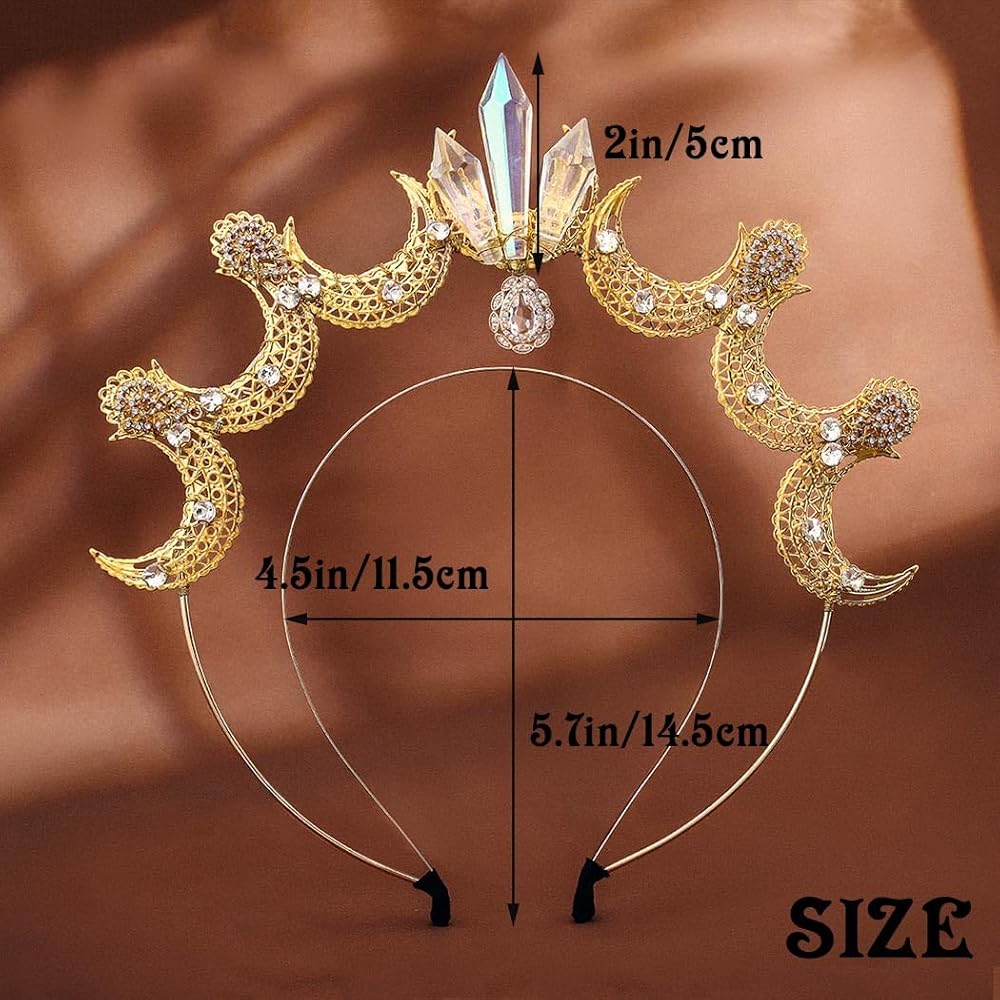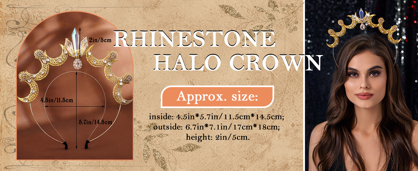 عصابة رأس هالة إلهة القمر ذهبية اللون. تقريبا. الحجم: من الداخل: 4.5 بوصة × 5.7 بوصة/11.5 سم × 14.5 سم؛ الخارج: 6.7 بوصة × 7.1 بوصة/17 سم × 18 سم؛ الارتفاع: 2 بوصة/5 سم. يرجى قبول خطأ بسيط في القياسات بسبب القياس اليدوي.