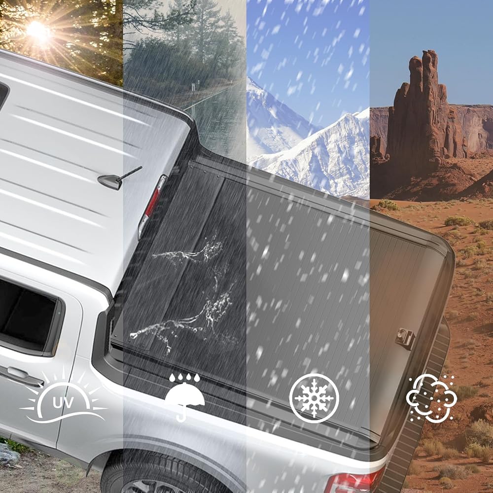 حماية فعالة: يتميز غطاء سرير الشاحنة بشرائح ألومنيوم قوية وسطح مطلي بمسحوق أسود غير لامع مزدوج الطبقة، قادر على دعم وزن يصل إلى 600 رطل. يمكن أن يمنع المطر والثلج والأوساخ والغبار من الدخول إلى غطاء سرير شاحنتك، مما يوفر حماية أفضل لأغراضك.