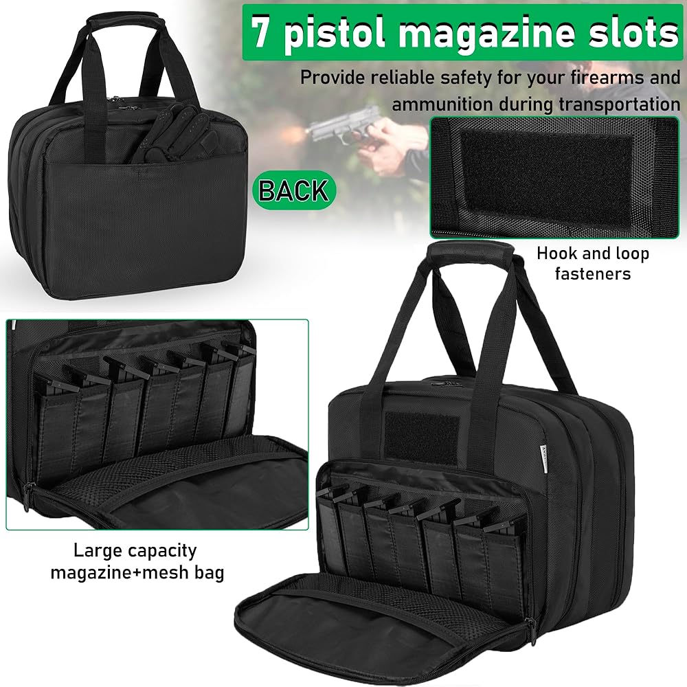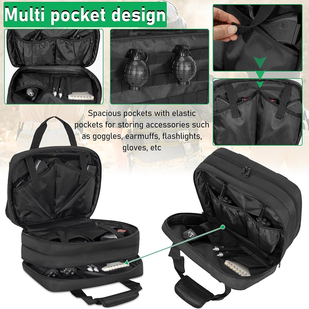 حقيبة المسدس التكتيكية: تنقسم المقصورة الرئيسية إلى أربعة أكياس مسدس مع أشرطة تثبيت، والتي تحمي مسدساتك وتجعلها منظمة بشكل جيد. يوفر الجيب الأمامي 7 فتحات ماج وحقيبة شبكية للتخزين، تناسب المجلات الأكثر شعبية بمقاسات 9 مم و40 و45 مم.