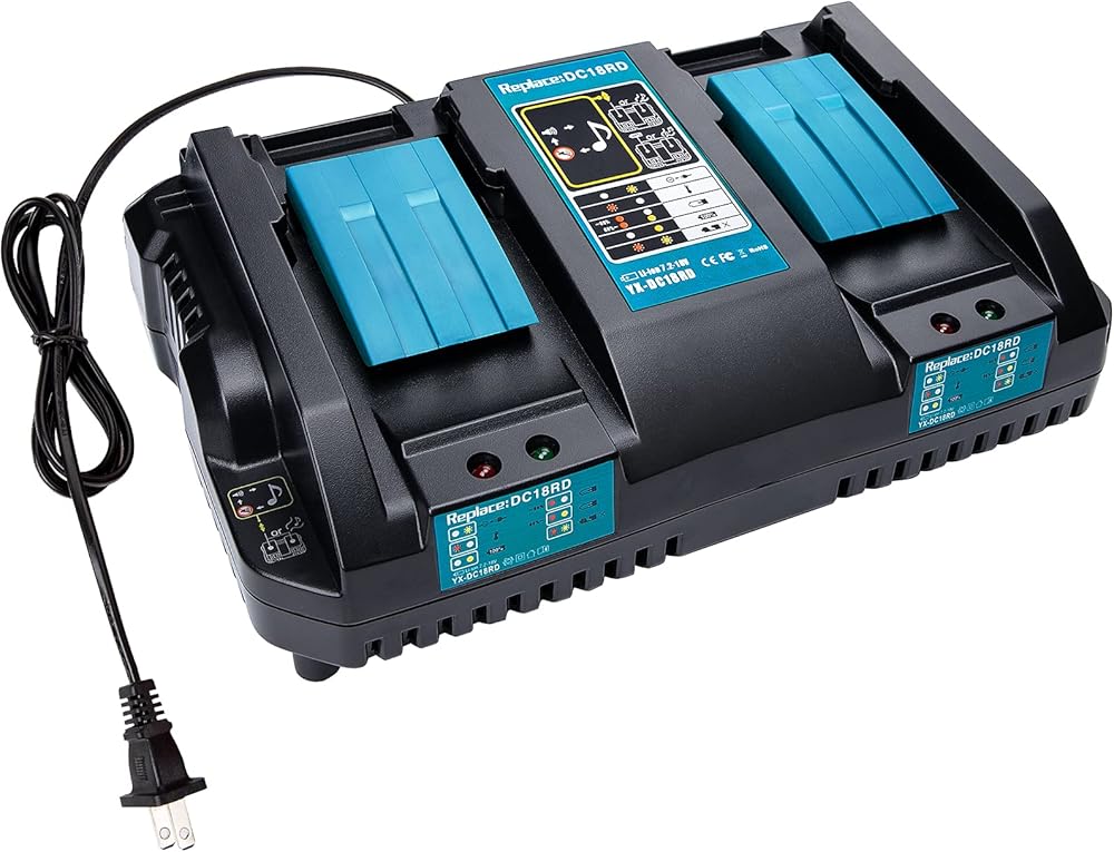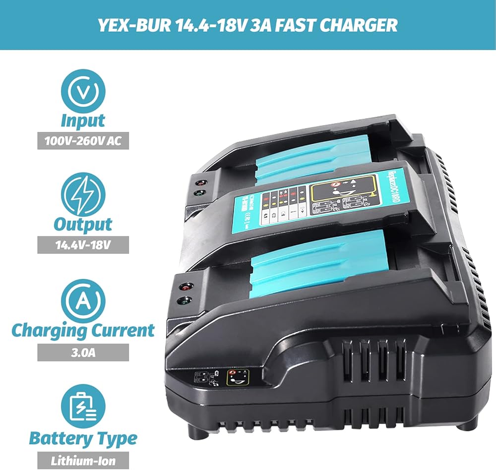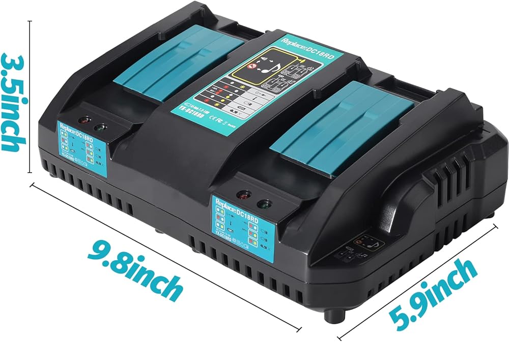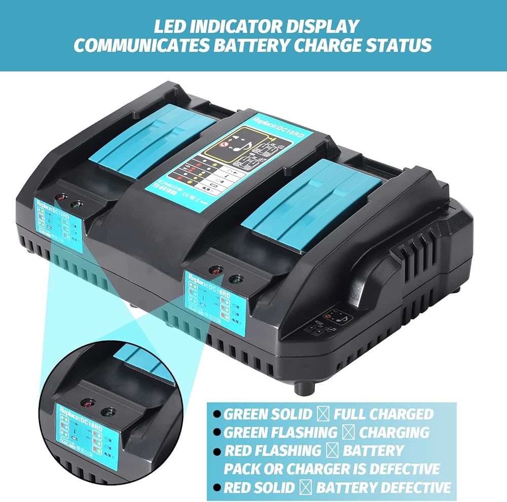 【FAST CHARGER】 Advanced charging technology, supports 100V-240V AC input, 6A output, It charges two 2.0Ah batteries in just 25 minutes, two 3.0Ah batteries in just 30 minutes, two 4.0Ah batteries in just 40 minutes, two 5.0Ah batteries in just 45 minutes, two 18V 6.0Ah batteries in just 60 minutes.