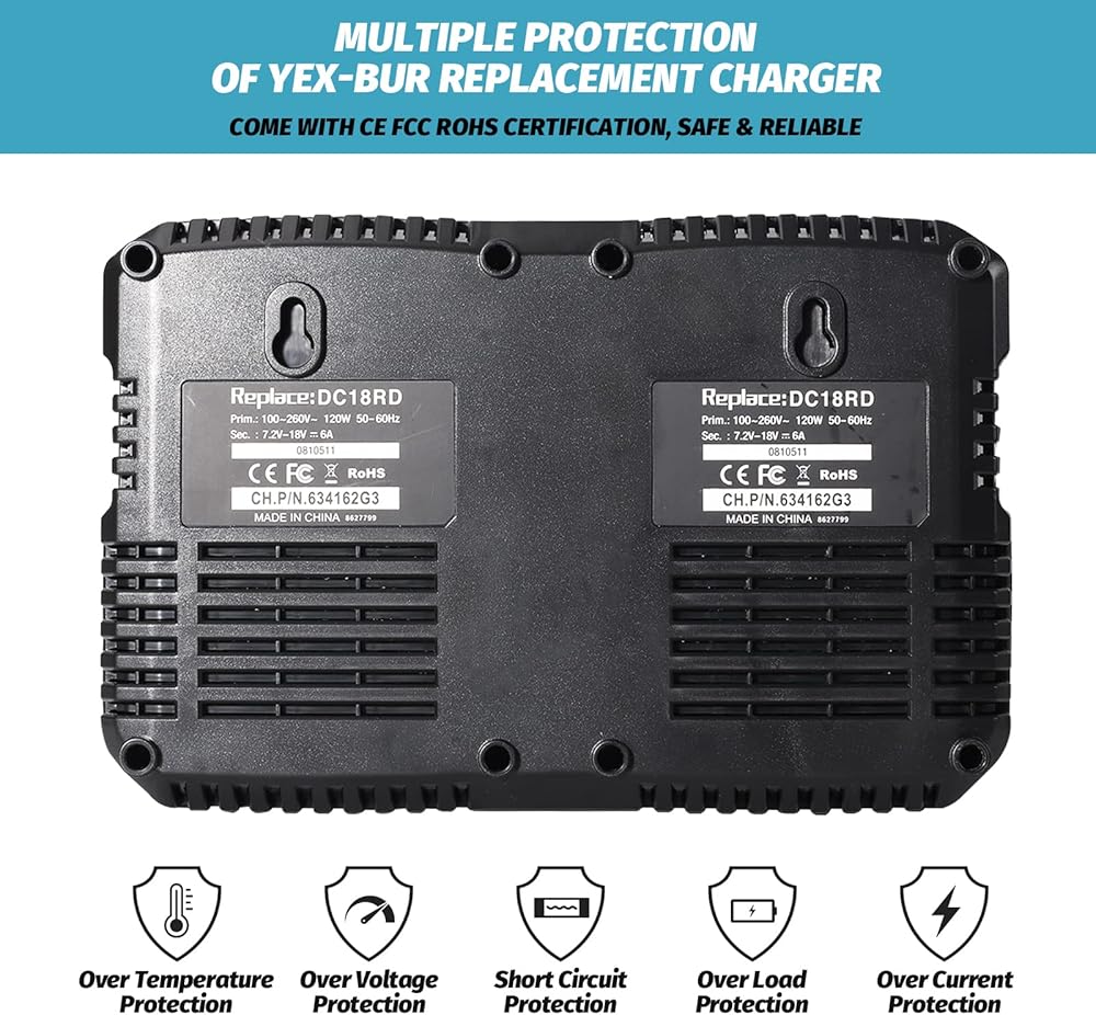 【UNIQUE COOLING SYSTEM】 YEX-BUR charger complies with FCC RoHS and CE safety test standards. With unique all-round heat dissipation design to protect your battery from overheating for longer battery life and protect your family's safety.