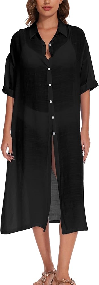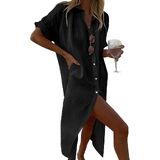 السمات: كم قصير، حاشية طويلة، زر سفلي لتغطية الشاطئ، قميص طويل. فستان قميص لقضاء العطلات أنيق وغير رسمي.