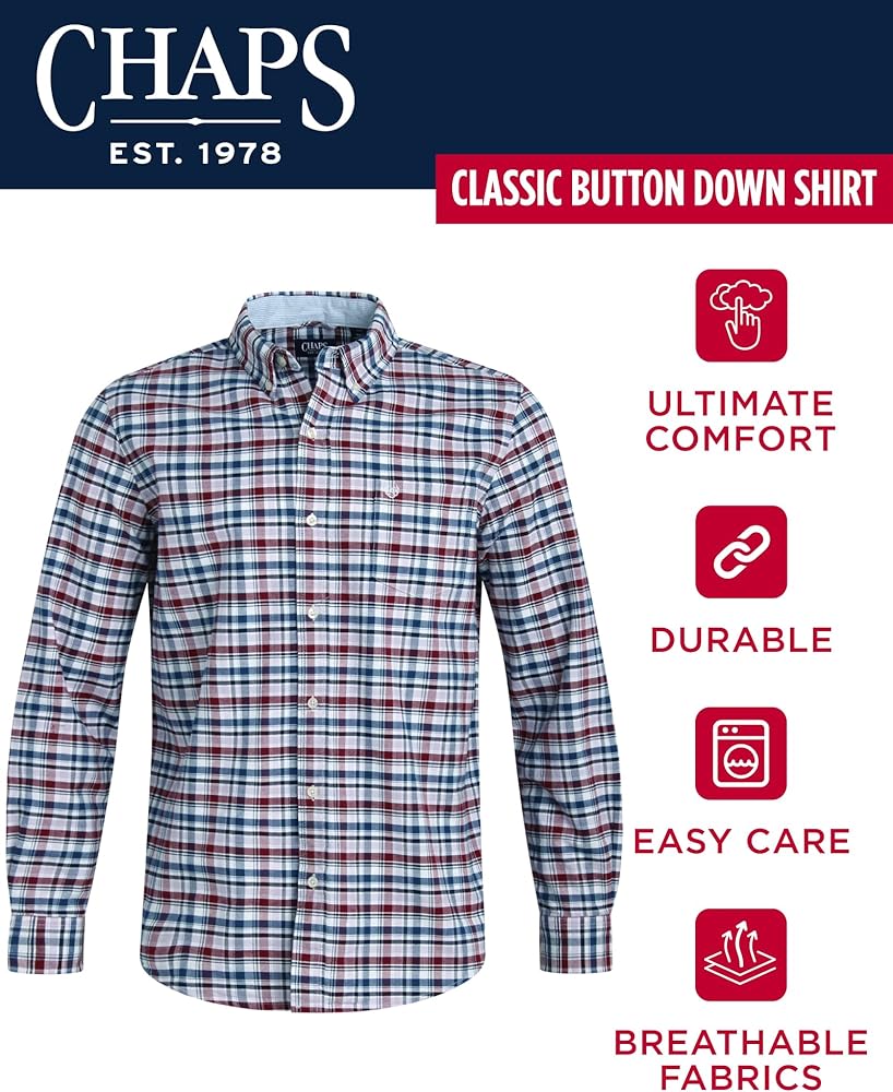 Chaps Men's Shirt - Relaxed Fit Comfort Stretch Button Down Oxford Shirt - Causal Long Sleeve Cotton Shirt for Men is a fashionable choice for men of all ages who enjoy wearing stylish outfits. A perfect addition to your wardrobe, this super smooth, lightweight, and breathable woven button-down long-sleeve shirt for men will match just about any outfit and provide a handsome look and comfort throughout the day. CLASSIC STYLE provides a great look and feel. This classic-fit button-down shirt for men moves freely to ensure you stay comfortable at work, campus, school, or when running errands or hanging out. Great men's shirt for office-wear. VARIOUS DESIGNS: Express yourself with this stylish plaid or solid shirt and choose your favorite design. Available in multiple colors, this fashionable outfit for men of all ages is a real must-have this season. VERSATILE enough to wear every day. You will get a lot of use from this comfortable button-down shirt. Ideal shirt to wear when hanging out, going to a work meeting, happy hours, or attending more formal occasions. GREAT GIFT: Get this classic and fashionable long-sleeve Oxford cotton shirt as a gift for your husband, boyfriend, father, grandfather, son, grandson, brother, nephew, uncle, cousin, or friend. EASY TO CLEAN: Simple to machine wash and dry; Please Reference the Variations for all Available Sizes and Colors. Chaps Offers Premium Clothing at Affordable Prices because we value every customer that visits our listings! Stop by Our Storefront to See the Rest of Our Great Deals; we're confident you're going to find items that anyone who needs a gift will really appreciate!