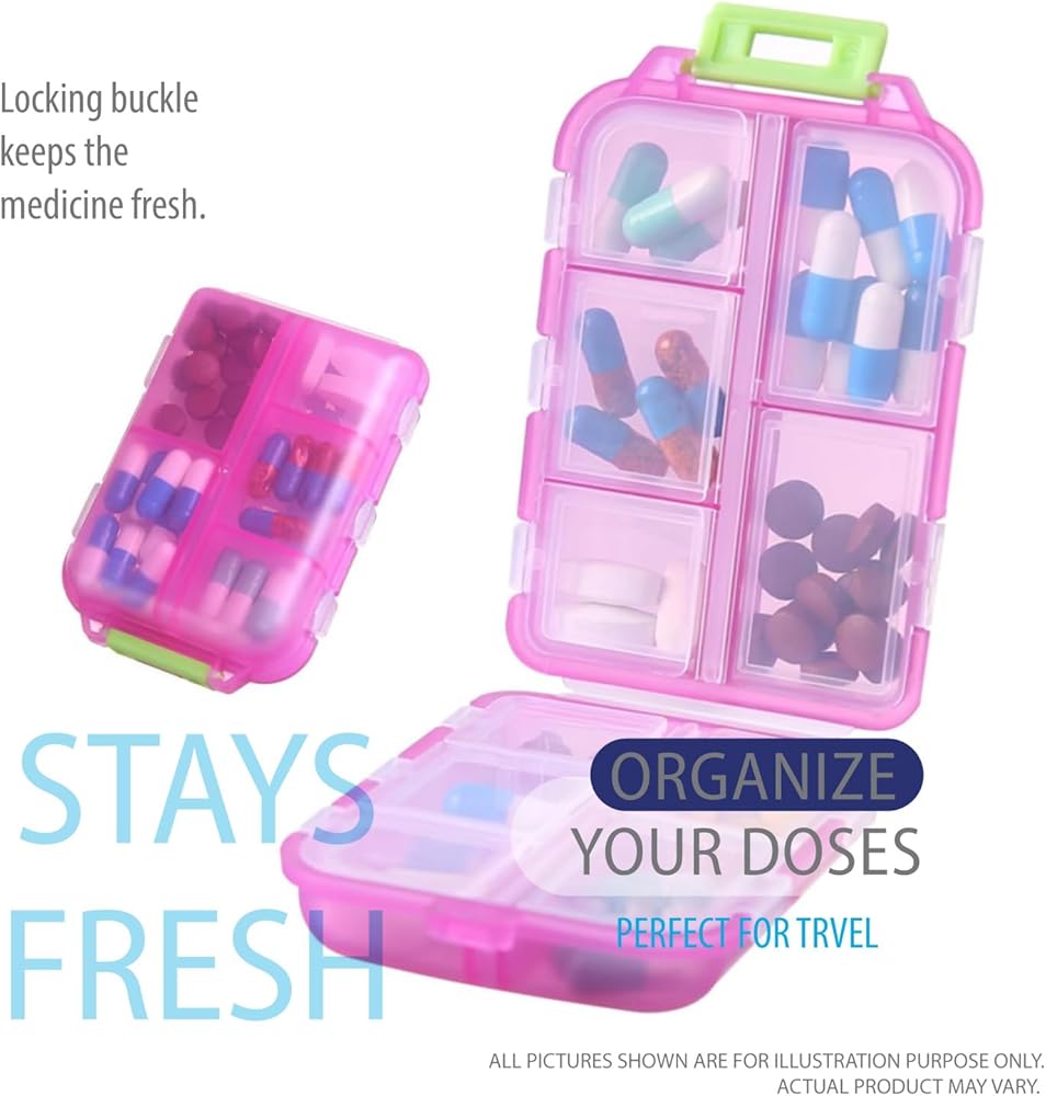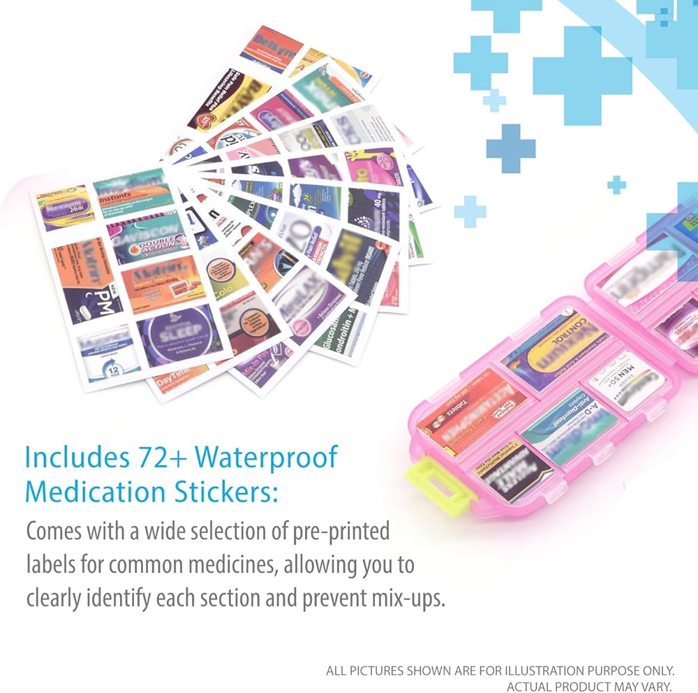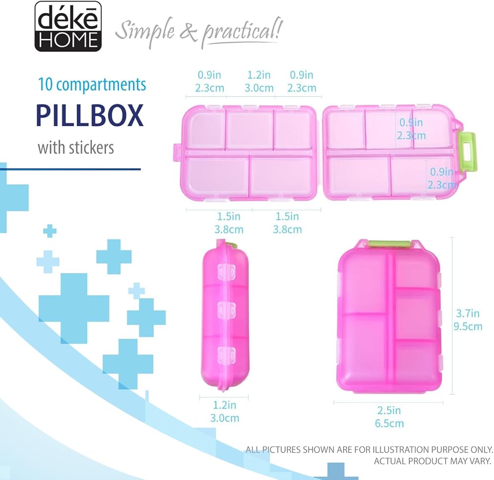 Deke Home - منظم حبوب الدواء المحمول مع 10 حجرات وملصقات ملصقات الأدوية، صندوق حبوب الدواء اليومي للسفر والفيتامينات والمكملات الغذائية وتخزين الأدوية، صغير الحجم، ملون، سهل التعرف عليه (وردي)