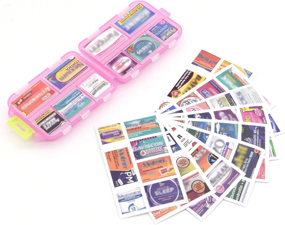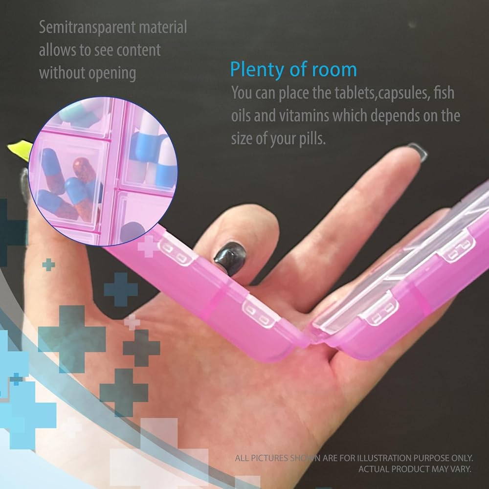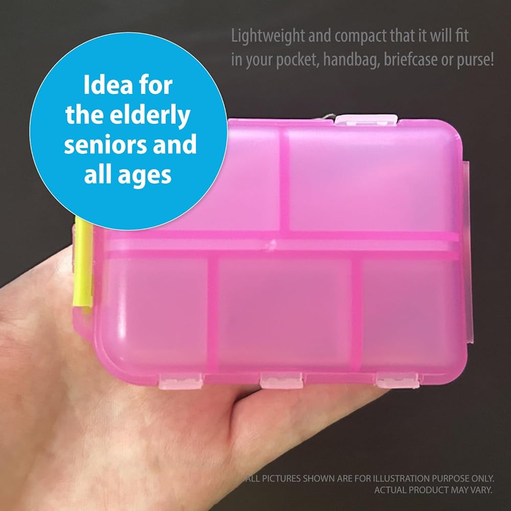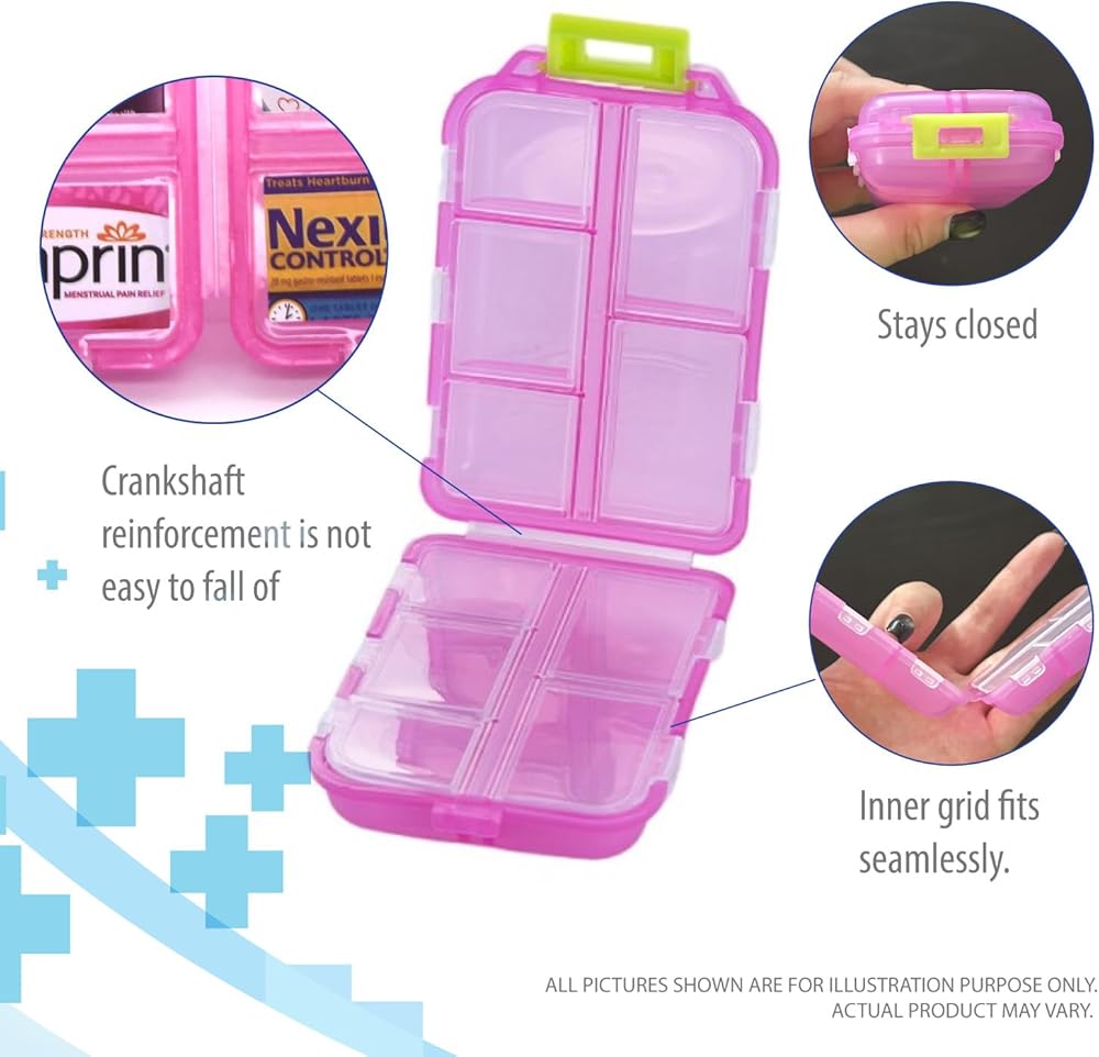 Deke Home - منظم حبوب الدواء المحمول مع 10 حجرات وملصقات ملصقات الأدوية، صندوق حبوب الدواء اليومي للسفر والفيتامينات والمكملات الغذائية وتخزين الأدوية، صغير الحجم، ملون، سهل التعرف عليه (وردي)