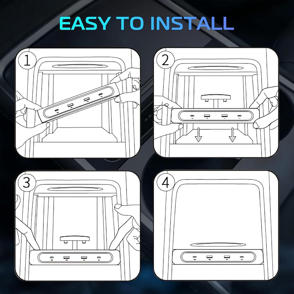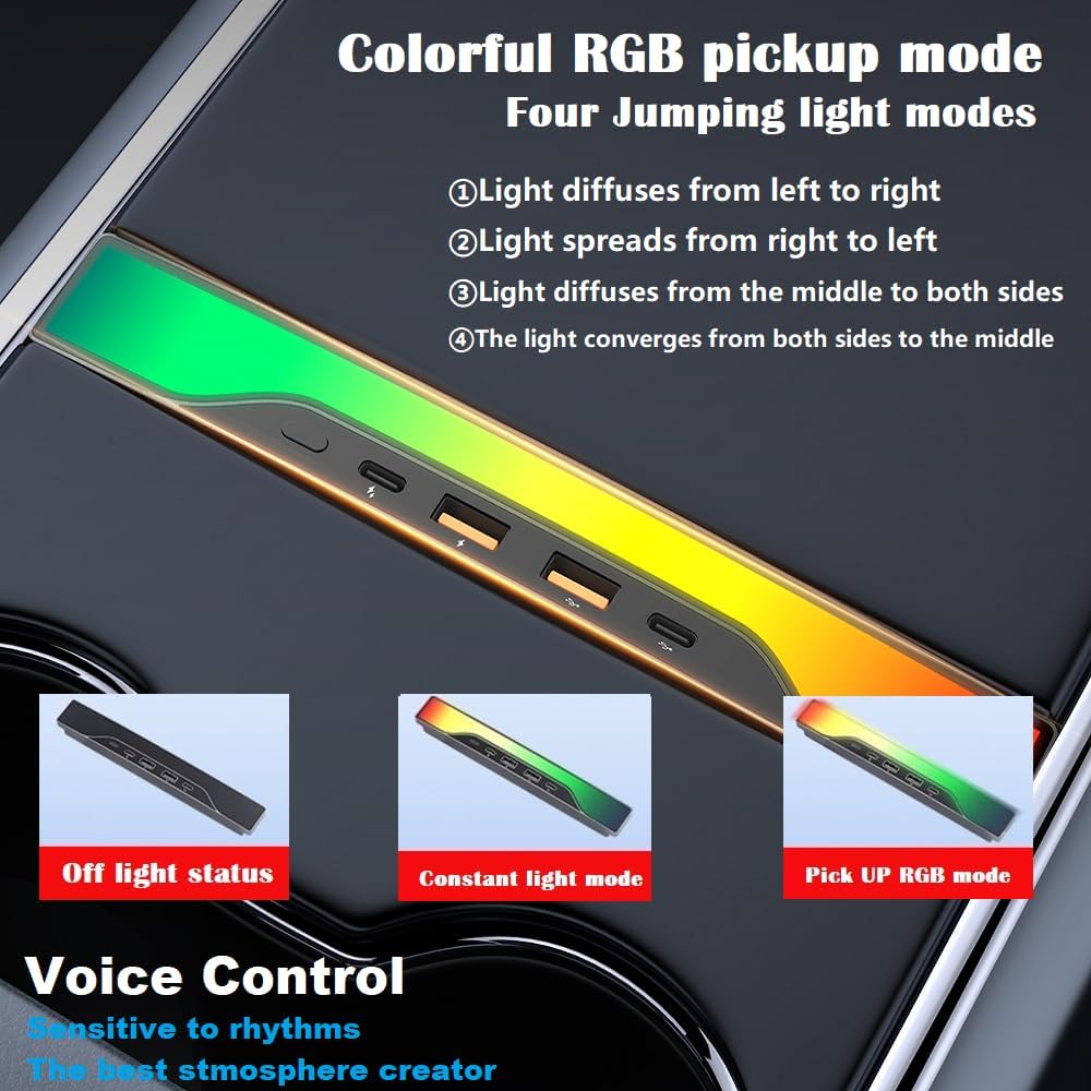 【سلامة معتمدة】محور USB LED لـ Tesla مصنوع من مادة PC+ABS عالية الجودة، مع شريحة ذكية ولوحة دائرة من فئة السيارة. مضمون للتشغيل الجيد والمتانة والصلابة لمنافذ USB الأربعة. هناك أمان معتمد ضد التيار الزائد والشحن الزائد وارتفاع درجة الحرارة