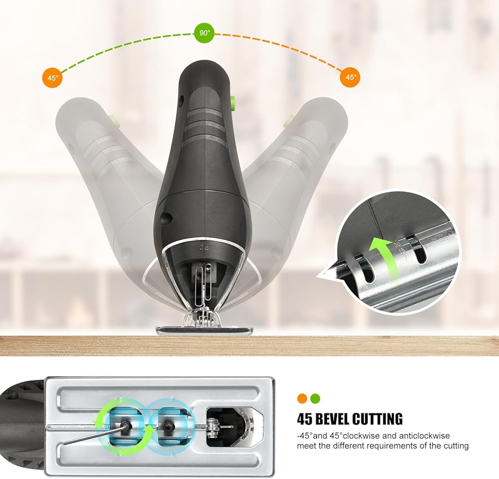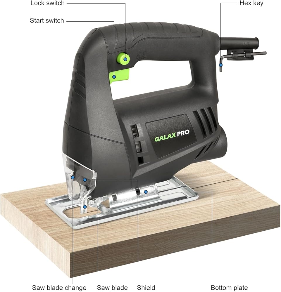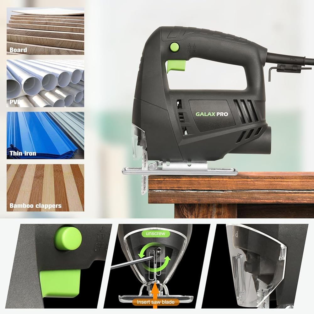 • محرك نقي 6.7 أمبير: محرك نحاسي نقي 800 واط يعمل على تشغيل أداة المنشار بسرعة 3000 دورة في الدقيقة، مما يوفر طاقة كافية لقطع الخشب والبلاستيك والمواد الفولاذية.