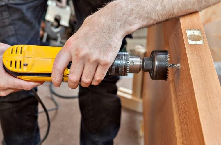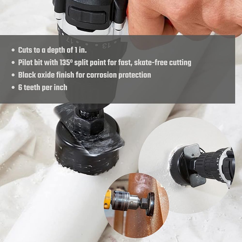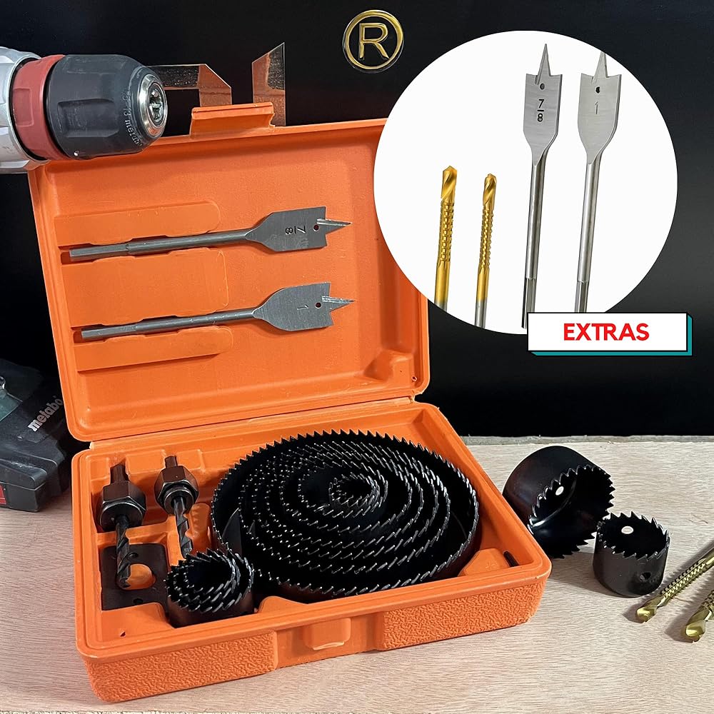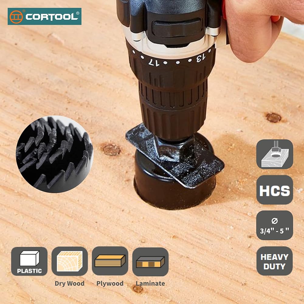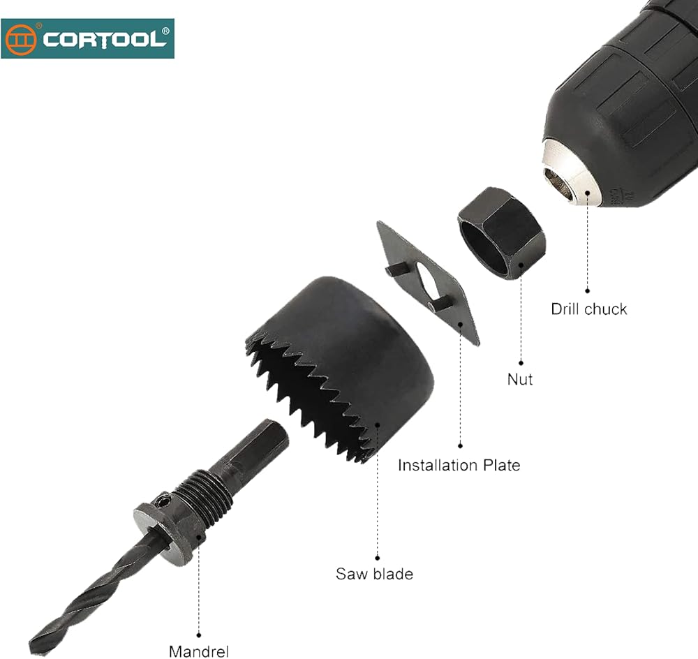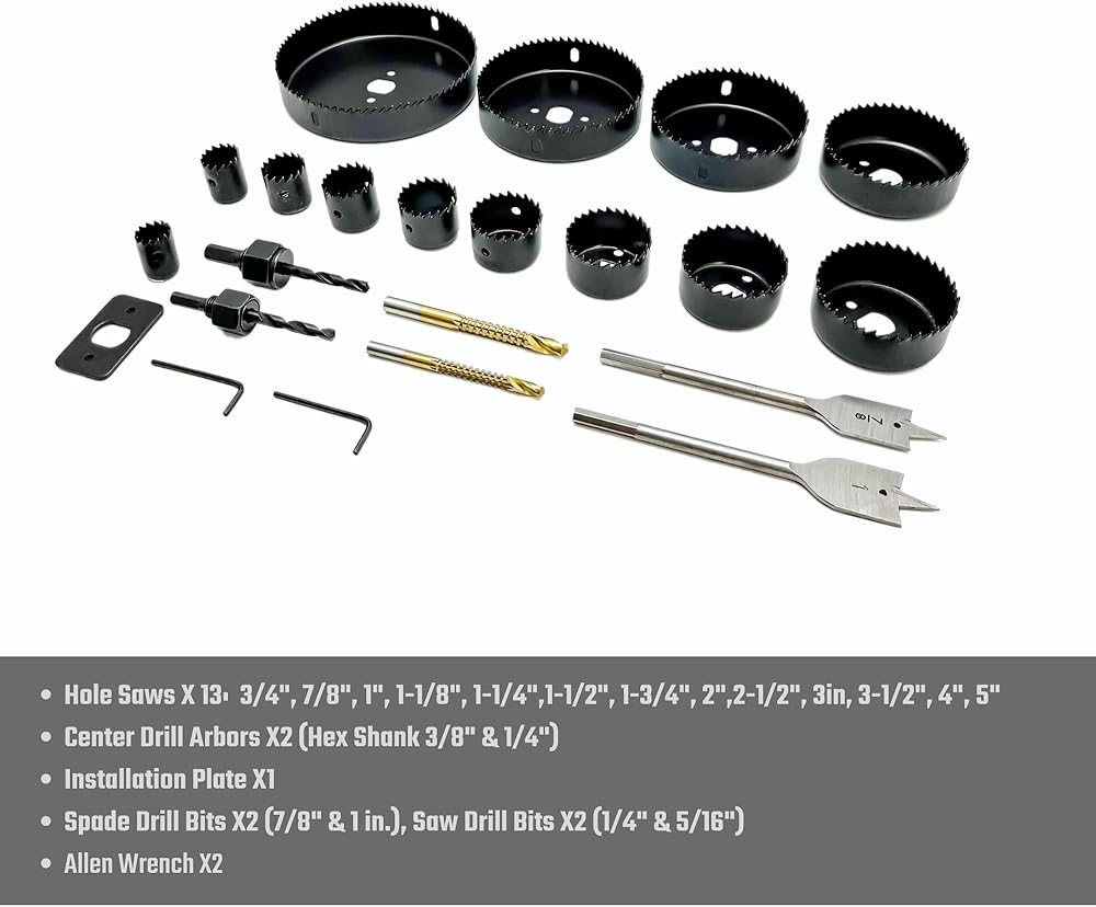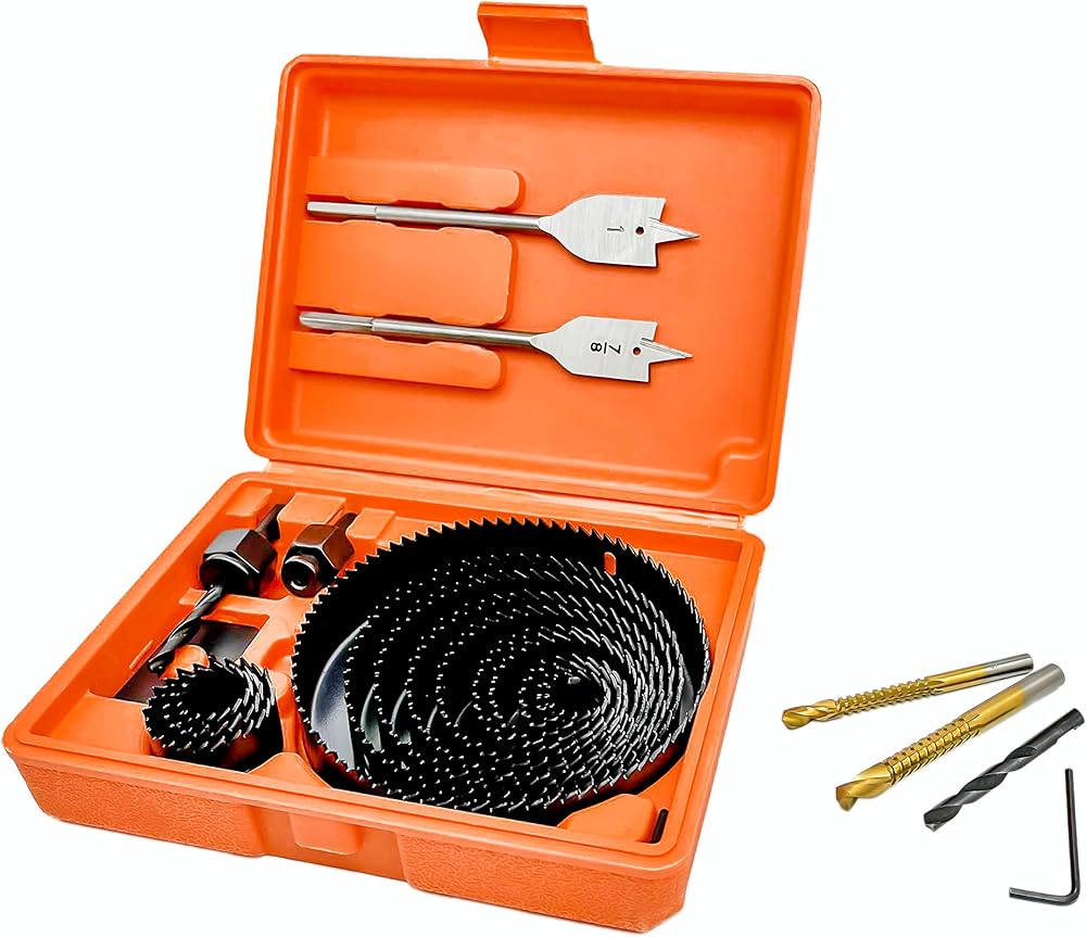 [THE MOST COMPLETE HOLE SAW KIT] Our hole saw set includes 12 most common sizes of saw blades:3/4" (19mm), 7/8" (22mm),1"(25mm), 1-1/8" (28mm), 1-1/4" (32mm), 1-1/2" (38mm), 1-3/4" (44mm), 2" (51mm), 2-1/2" (64mm), 3" (76mm), 3-1/2" (89mm), 4" (102mm), 5" (127mm),3 mandrels with 2 nuts, 2 Hex Key, 2 Twist Drill,1 Install Plate. These tools are there to satisfy all your needs. [DURABLE AND SAFETY] Carbon Steel, Heat Treated. High strength and hardness, design for increased durability and outstanding cutting performance. Our hole saw features a reinforced shoulder for added strength and longer life. [EFFICIENT AND ACCURATE] High precision, smooth cutting edge. Super sharp saw teeth have been designed to cut faster, no material get stuck makes work faster and better finished. [EASY TO SET UP] All the tools you need for quick and easy saw changing. A hex key and install plate are included for tool installation. Mandrels with 20mm nuts that can be adjusted by hand or using a spanner when greater tightness is required. [PERFECT FOR MULTI-PURPOSE] Suitable for soft wood, plywood, oak, thin PVC board, plastic,drywall but not metal, great for tasks including cutting holes in desk surfaces, doors, furniture and cabinets. Serve for fitting handles and locks for furniture.