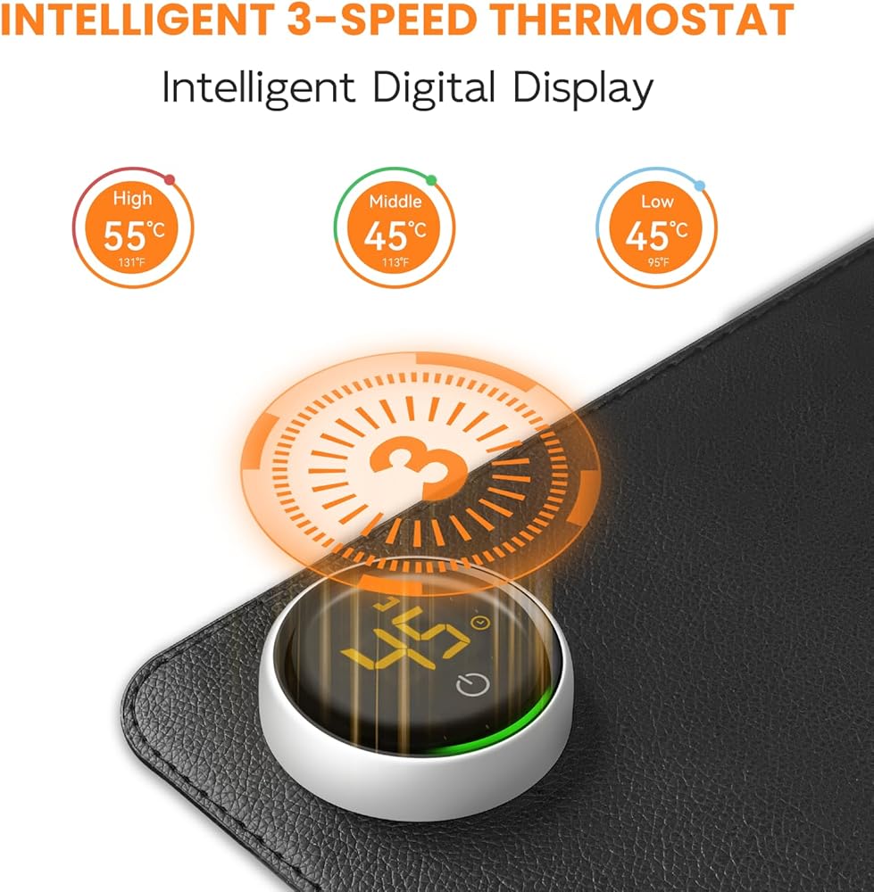 ✅【3 مستويات تحكم ووظيفة توقيت 6 سرعات】وسادة مكتب ساخنة للوحة المفاتيح والماوس. تحتوي وسادات الماوس الساخنة على 3 مستويات لدرجة الحرارة 35 درجة مئوية، 45 درجة مئوية، 55 درجة مئوية (95 درجة فهرنهايت، 113 درجة فهرنهايت، 131 درجة فهرنهايت). 6 مستويات للتحكم في إيقاف التشغيل التلقائي (ساعتان، 4 ساعات، 6 ساعات، 8 ساعات، 10 ساعات، 12 ساعة). يتيح لك اختيار الوقت المناسب لقطع الطاقة وفقًا لاحتياجاتك الخاصة.
