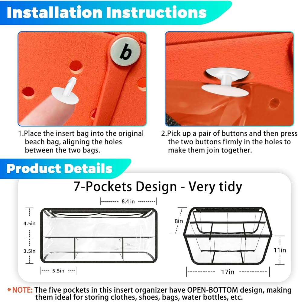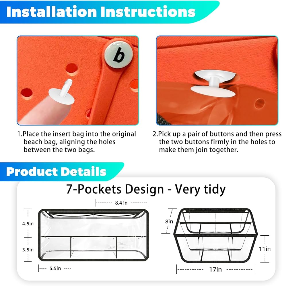 • 【سهلة الاستخدام】: تأتي حقائب التنظيم الخاصة بنا مع 10 مقابض لتركيبها. ما عليك سوى استخدام المقابض لدمج حقيبة الشاطئ مع حقيبة التنظيم ويمكن إدخال هذه الحقائب بسهولة وإحكام في الفتحات الموجودة بجانب حقيبة الشاطئ.