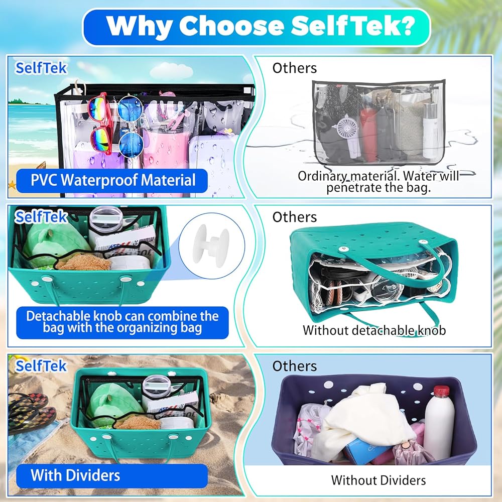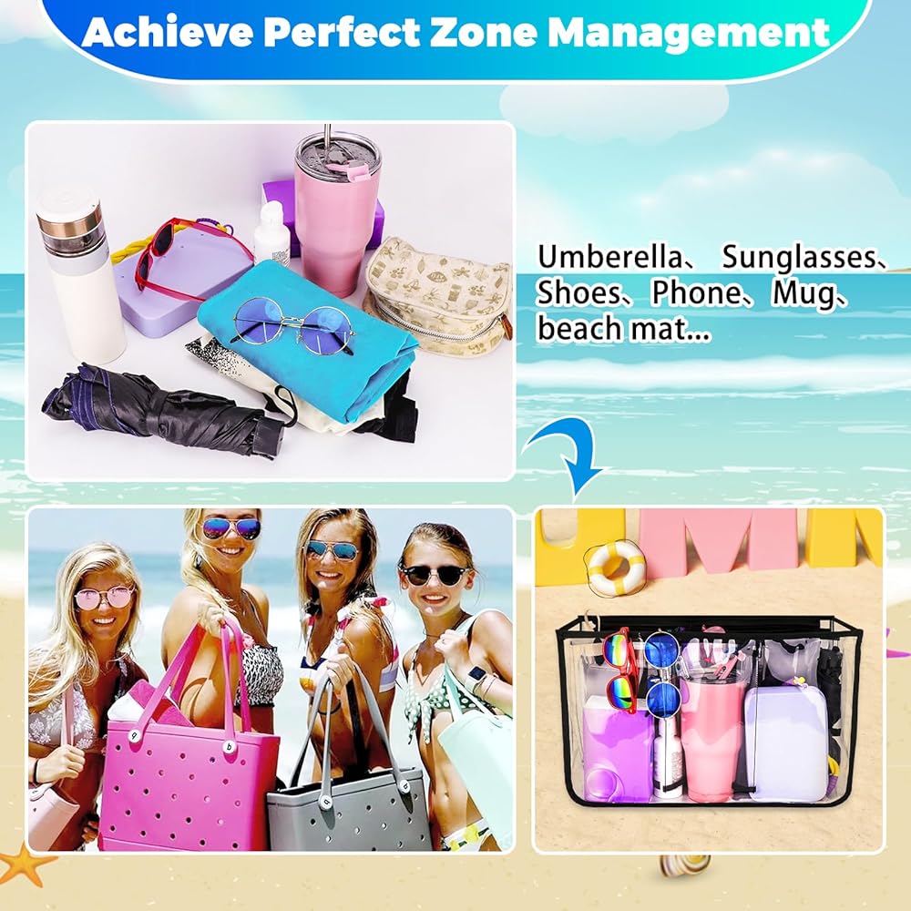 ملحق منظم حقيبة الشاطئ الشفاف من SelfTek متوافق مع حقيبة Bogg الأصلية مقاس X كبير، حقيبة تخزين مقسمة للحقيبة الداخلية بسحاب لملحقات حقيبة Bogg، حقيبة مقسمة 7 - شفافة وأسود