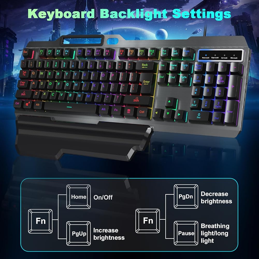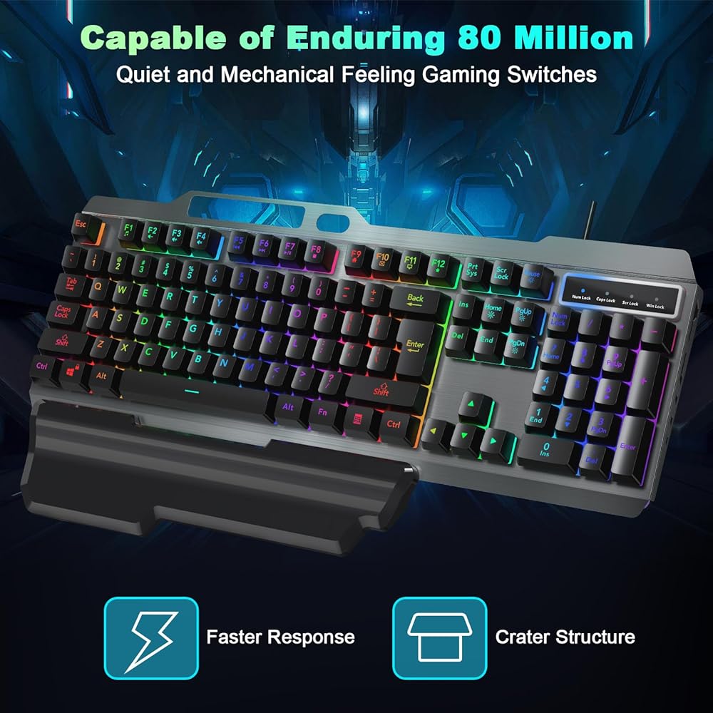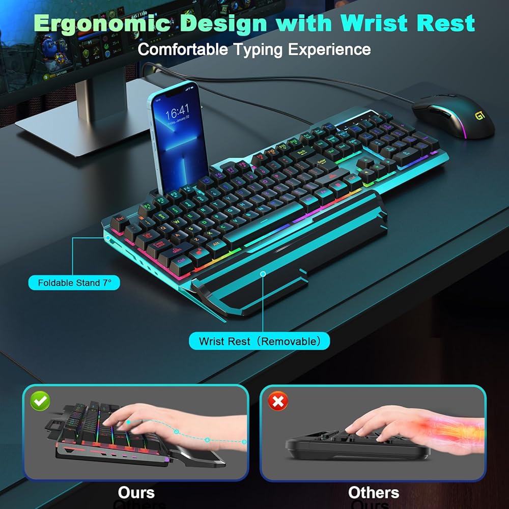🎁مسند معصم مريح: تم تصميم لوحة المفاتيح المضيئة لدينا، المجهزة بمسند للمعصم وحامل قابل للطي، لتحقيق أقصى قدر من راحة اليد أثناء جلسات اللعب أو العمل الممتدة. يضمن تصميم أغطية المفاتيح العلمية على شكل سلم بقاء يديك في الحالة الأكثر طبيعية. توفر جميع المفاتيح لمسة ناعمة دون إصدار أصوات نقر عالية.