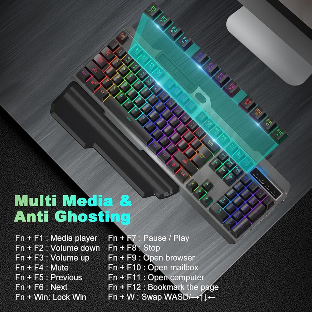 🎁الوسائط المتعددة ومكافحة الظلال: مع 12 مفتاحًا للوسائط المتعددة، يمكنك تحسين عمليات الألعاب أو كفاءة العمل. تحتوي لوحة المفاتيح على 26 مفتاحًا خاليًا من التعارضات، مما يبقيك متحكمًا عند الضغط على مفاتيح ألعاب متعددة في وقت واحد. يمكنك تبديل مفاتيح WSAD بمفاتيح الأسهم بالضغط على FN+W وقفل/فتح مفتاح WIN بالضغط على FN+WIN. (ملاحظة: مفاتيح الوسائط المتعددة غير متوفرة على نظام Mac.)