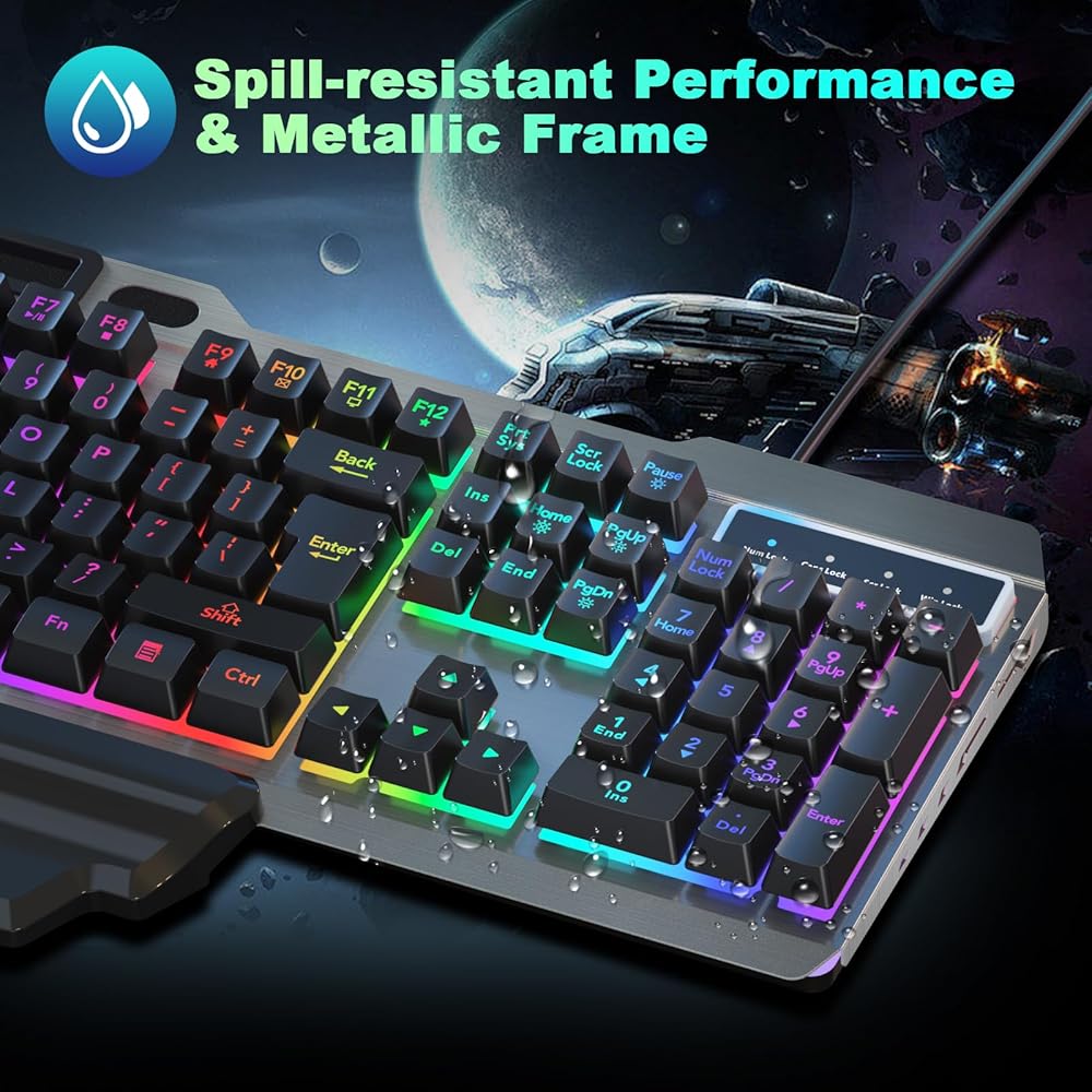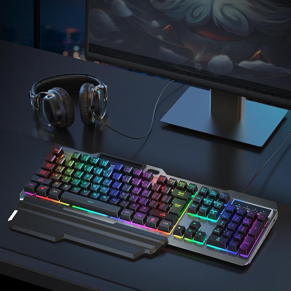 لوحة مفاتيح سلكية للألعاب cimetech، لوحة مفاتيح كمبيوتر بإضاءة خلفية LED بألوان قوس قزح مضادة للظلال مع مسند للمعصم، تصميم مقاوم للانسكاب، مفاتيح الوسائط المتعددة، لوحة مفاتيح مريحة هادئة لأجهزة الكمبيوتر المحمول Windows PC Mac