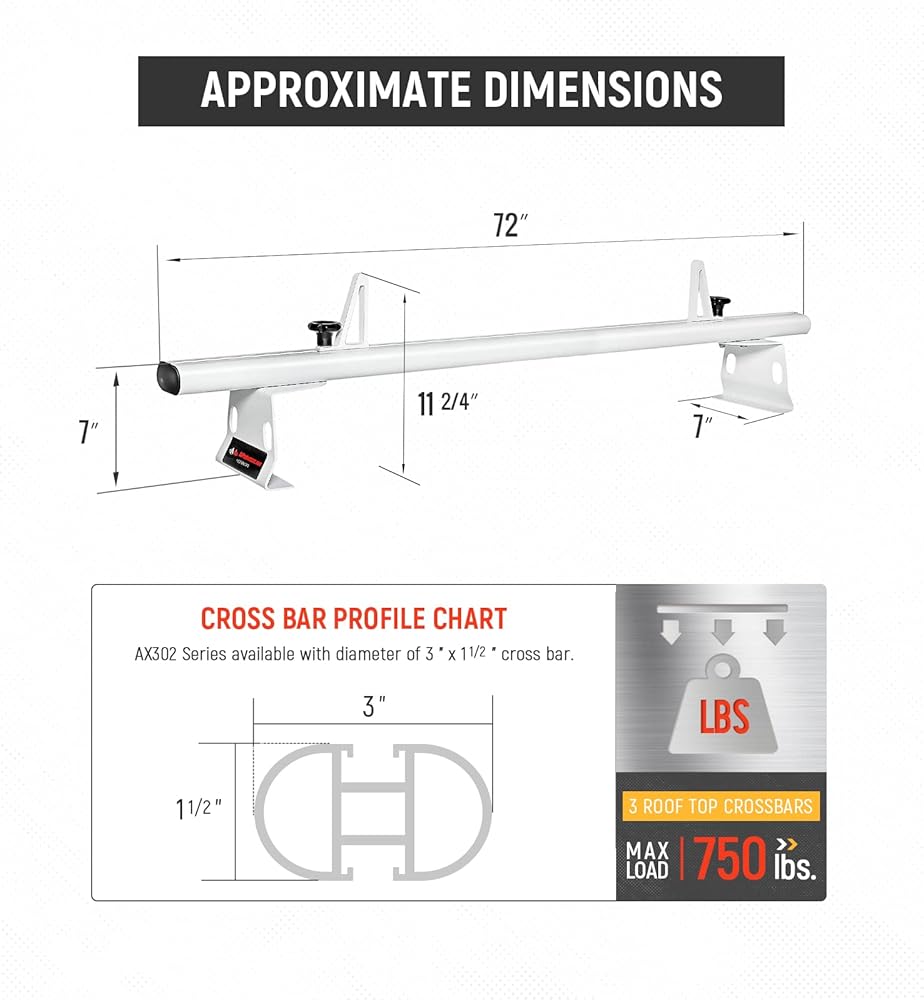 - 3 عوارض، ألومنيوم مقذوف. سعة الحمولة القصوى 750 رطلاً. طول القضيب المتقاطع: 72 بوصة