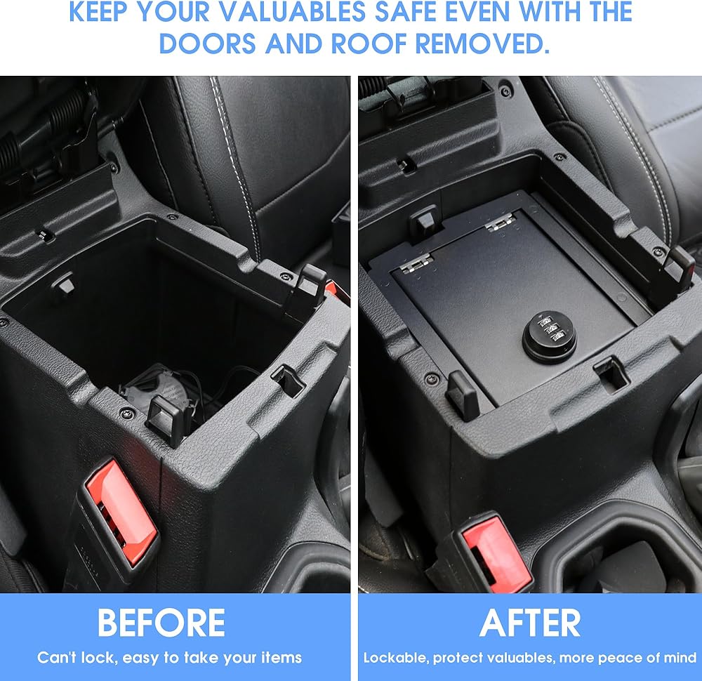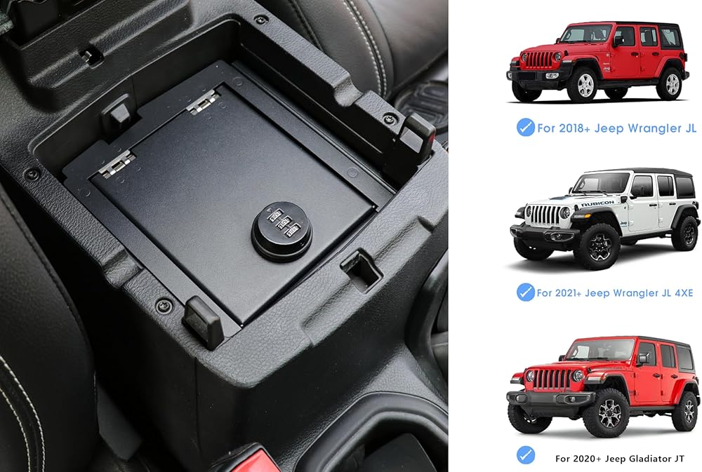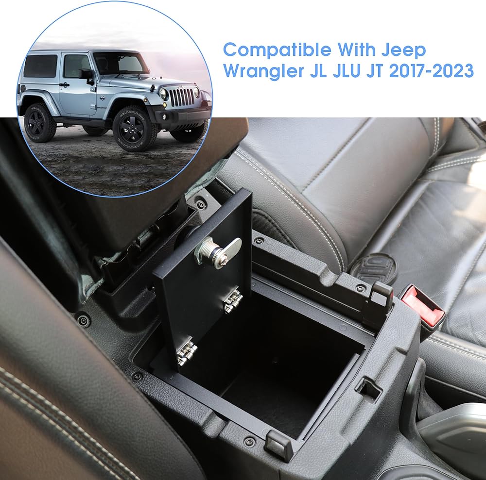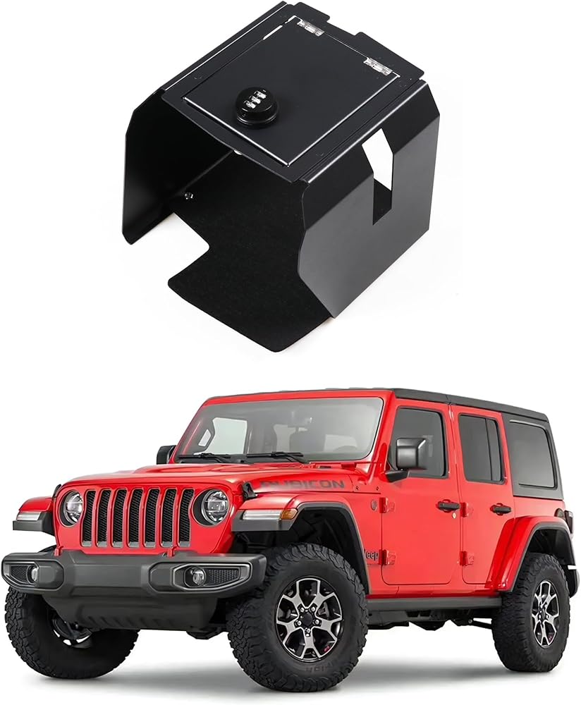 منظم تخزين مسند ذراع لقفل وحدة التحكم المركزية لسيارة جيب رانجلر - صندوق آمن للبندقية مع كلمة مرور كومبو مكونة من 3 أرقام لـ 2018-2023 Jeep JL 4XE Gladiator JT Accessories 2 4 باب، أسود