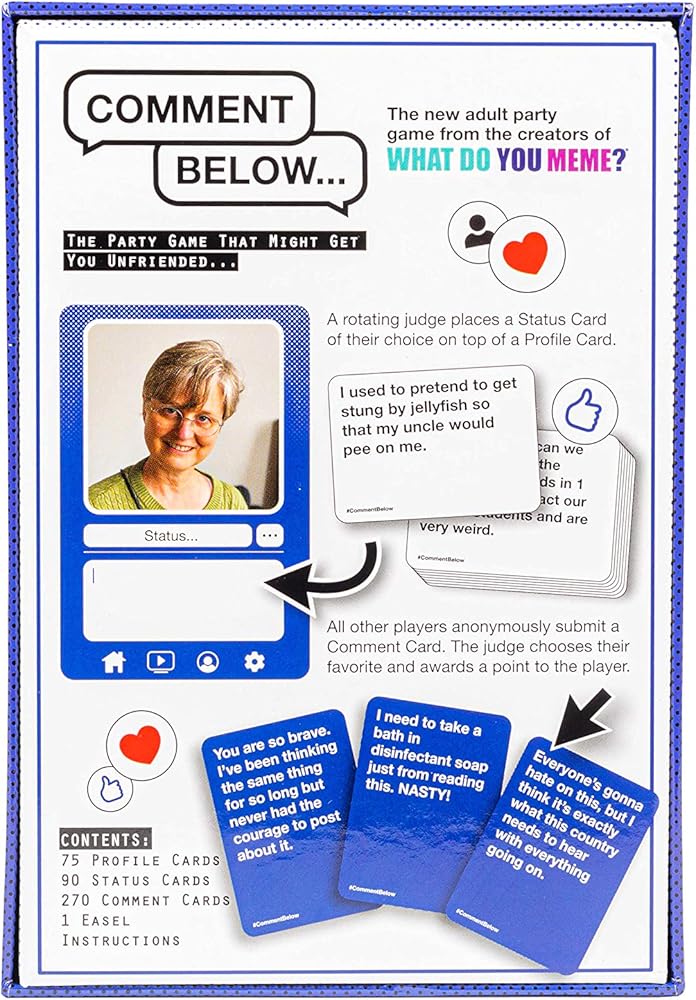 استعد لخداع أصدقائك: تنافس مع أصدقائك وعائلتك حيث يتم ذكر كل شيء (مجازيًا) في قسم التعليقات! كيف؟ ما عليك سوى إقران بطاقة التعليق الأكثر مرحًا لديك مع مجموعة الملف الشخصي وبطاقة الحالة المختارة في كل جولة لإنشاء الرد على التعليق الذي يجعل القاضي مذهولًا. يقدمها لك منشئو What Do You Meme.