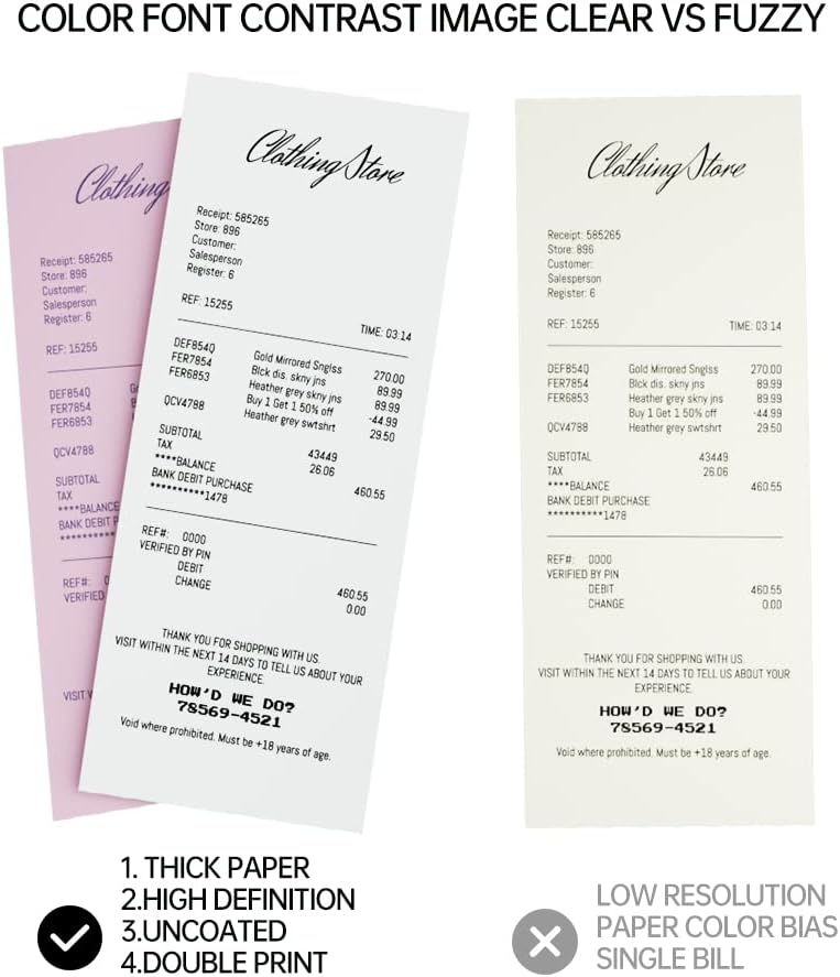 ورق النسخ الخالي من الكربون هذا المكون من طبقتين لطباعة الإيصالات مصنوع من مواد عالية الجودة تضمن الحصول على مطبوعات واضحة وسهلة القراءة. بالإضافة إلى ذلك، فهي خالية من مادة BPA والكربون، مما يجعلها خيارًا أكثر أمانًا وصحة لاحتياجات الطباعة الخاصة بك. لا تتطلب ورقة الاستقبال هذه حرارة أو مواد كيميائية لإنشاء صورة. يميل أيضًا إلى الاستمرار لفترة أطول من الورق الحراري.