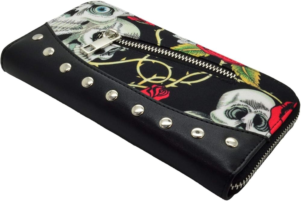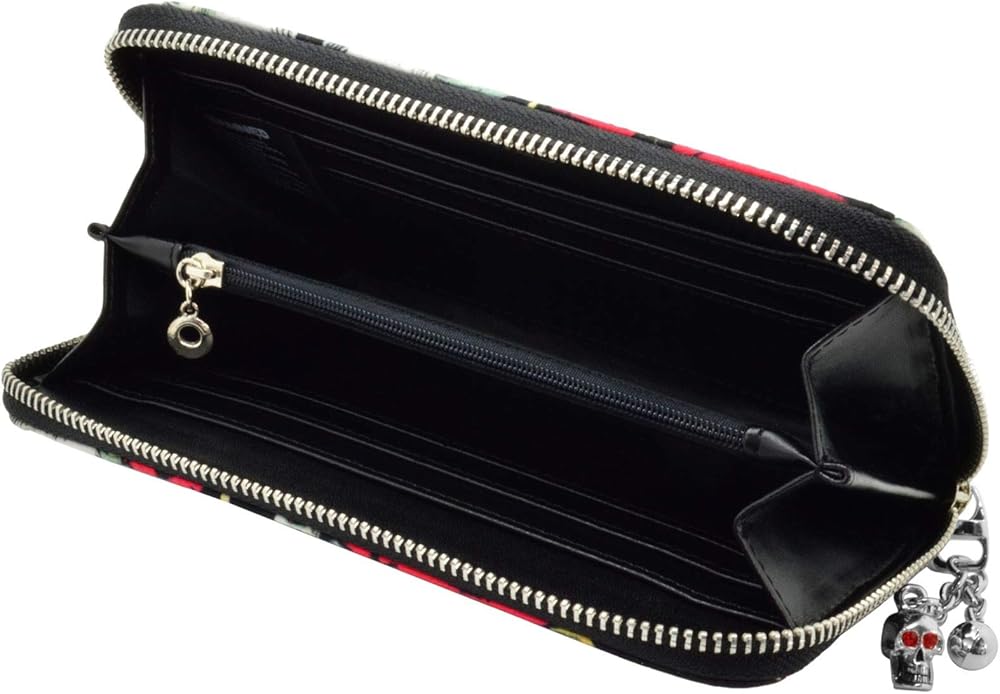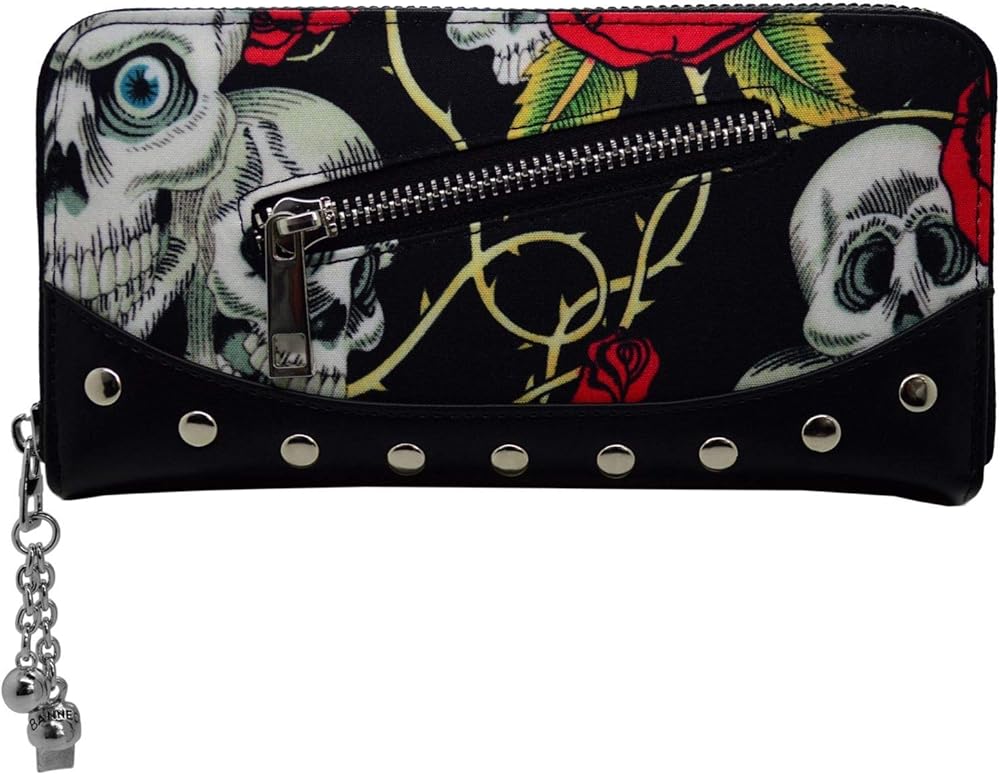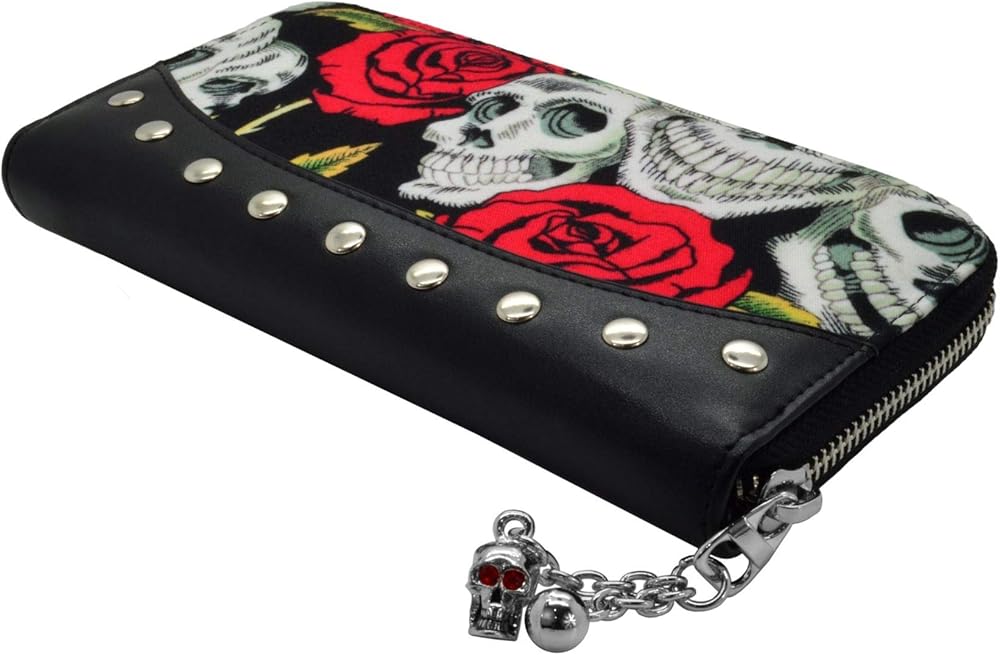 The Skulls and Roses Wallet from Lost Queen is a must have for anyone with an alternative style! This Purse features a bold and vibrant pattern of skulls, red roses, and thorns all over accented with faux leather and metal rivets. Inside the Purse is a number of compartments for all your cards, cash, and other essentials and necessities. With a skull charm and ball zip closure bringing it all together, it's the perfect eye-catching Purse to suit any need.