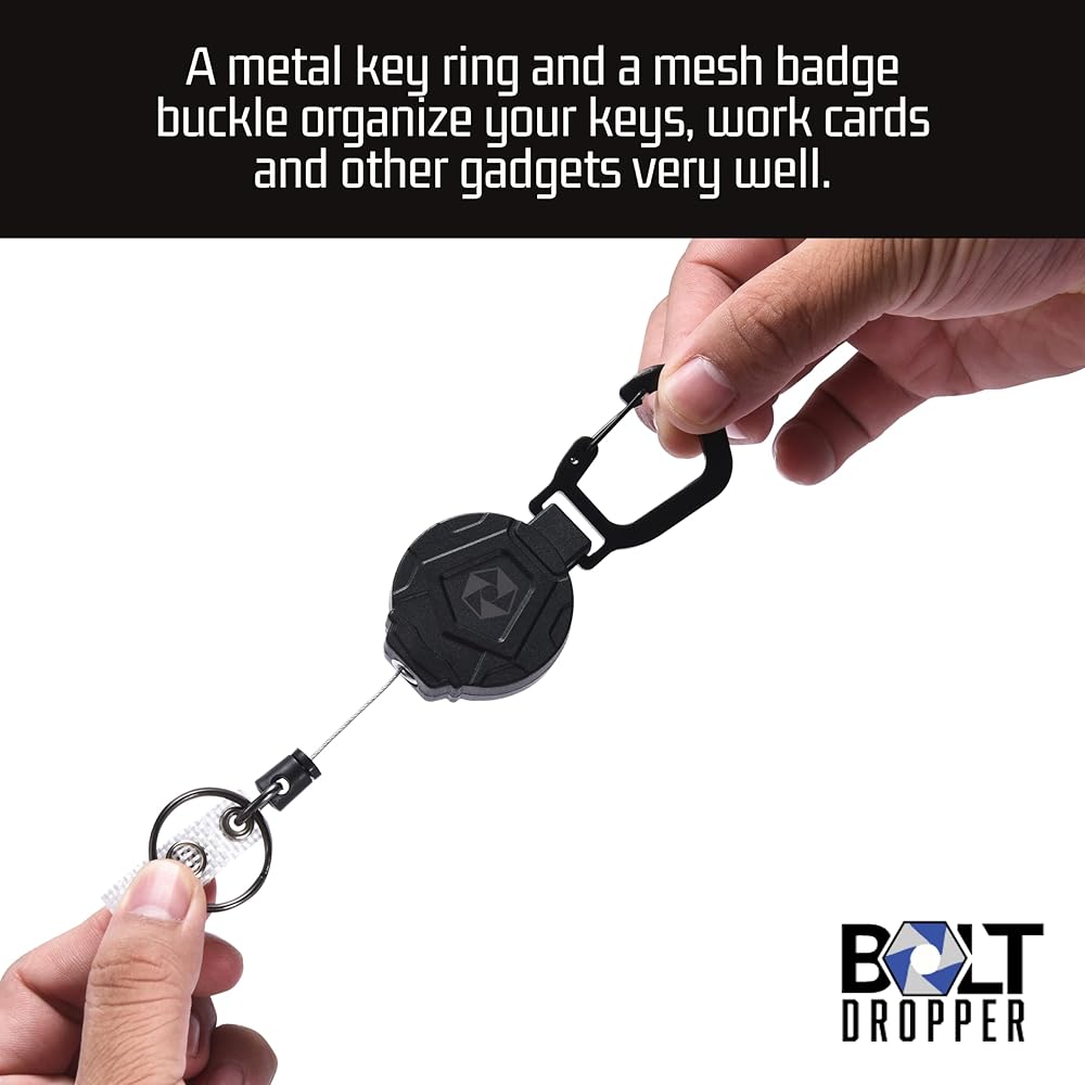 حلقات مفاتيح قابلة للسحب بقطارة بولت - حامل شارة حلقة مفاتيح شديدة التحمل، بكرة شارة الهوية التكتيكية مع سلك فولاذي قابل للسحب لسلسلة المفاتيح - حامل شارة تعريف العمل - حزمة من 2