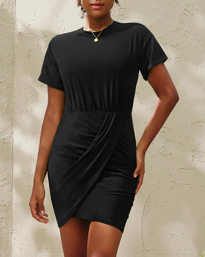 【تصميم فساتين النساء لصيف 2024】أكمام قصيرة غير رسمية، فستان ملفوف، مكشكش، مطوي، صلب، خصر مرن، رقبة دائرية، حاشية غير منتظمة، قصير، فستان قصير عصري.