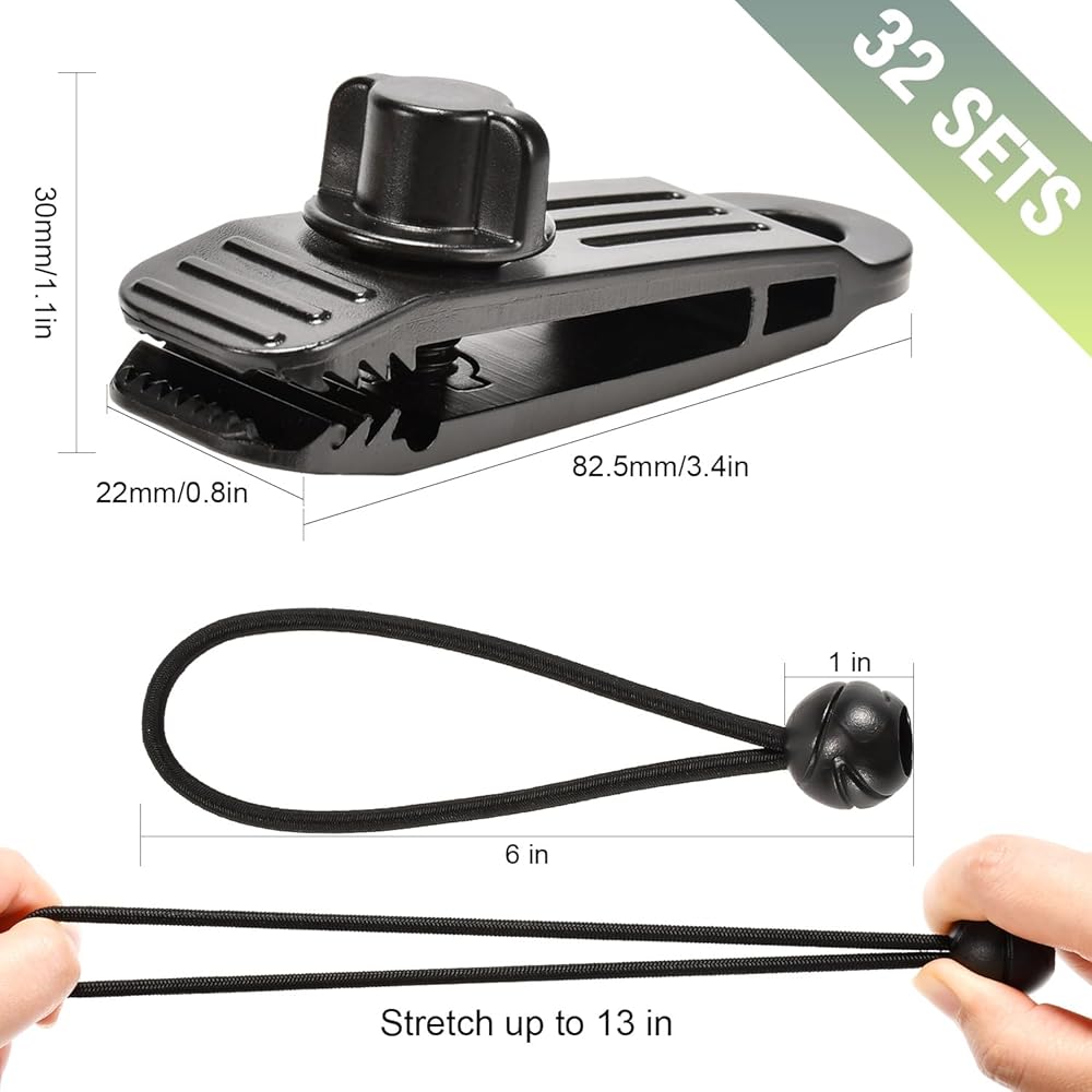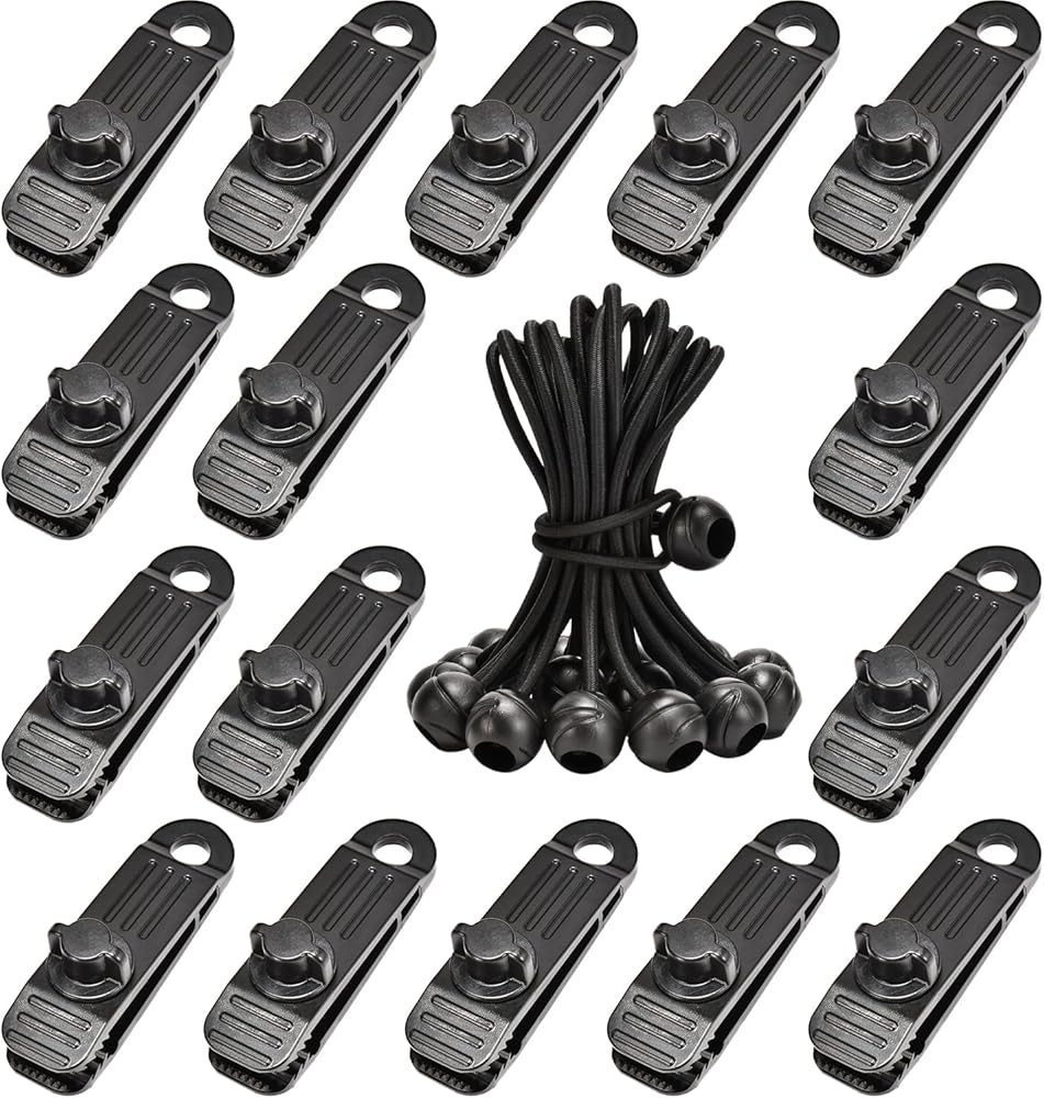 مجموعة كاملة للاستخدام متعدد الاستخدامات: تحتوي هذه المجموعة على 16 مشبكًا للقماش و16 حبلًا بنجيًا كرويًا، مما يوفر معدات آمنة للاستخدام في الهواء الطلق. مثالية للتخييم، وأغطية حمامات السباحة، وأكثر من ذلك، تضمن هذه المجموعة بقاء الأقمشة الخاصة بك في مكانها تحت الرياح القوية والظروف الجوية السيئة.