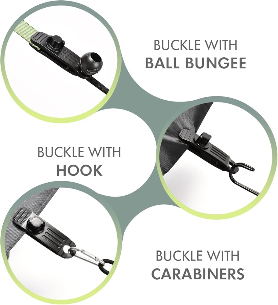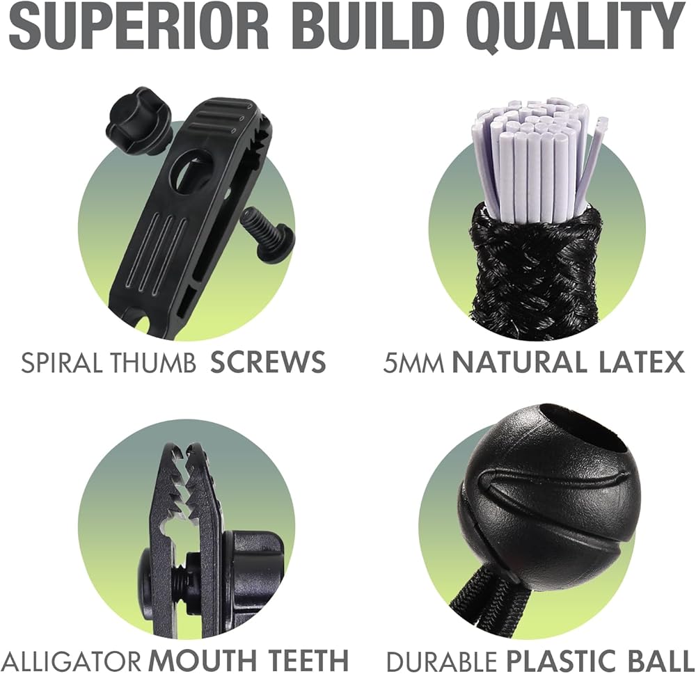 مواد عالية الجودة: مصنوعة من مواد عالية القوة، هذه المشابك متينة ومقاومة للماء ومقاومة للطقس. الحبال المطاطية مصنوعة من مطاط قوي، مما يضمن الاستخدام طويل الأمد في أي بيئة.